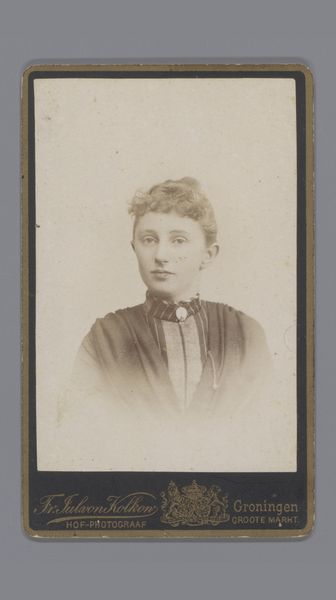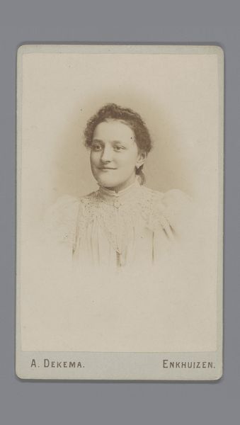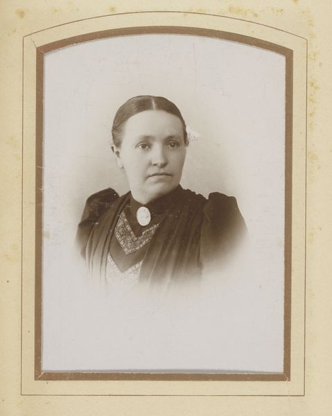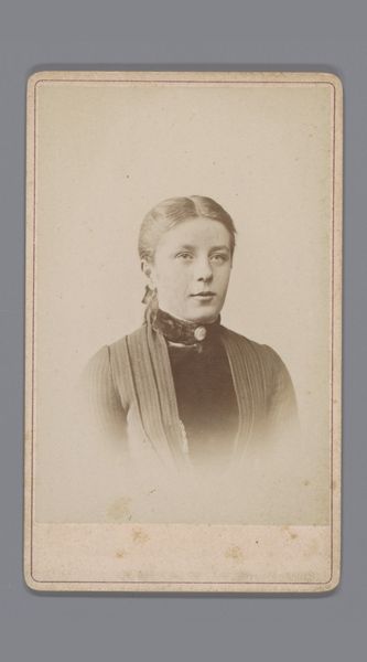 Editor: Here we have Albert Dekema's "Portrait of an Unknown Young Woman," taken sometime between 1880 and 1896, a photograph from the Rijksmuseum. It's quite a simple composition, a head and shoulders shot in sepia tones. The subject's gaze is very direct and unsmiling. What strikes you most about this piece? Curator: It’s fascinating how a seemingly simple portrait can tell us so much about the cultural landscape of its time. Consider the institutional power at play here. Photography, by the late 19th century, was becoming increasingly accessible, moving away from the exclusive domain of the wealthy. But, were portraits such as these viewed differently, perhaps even deemed less ‘artistic’ than painted portraits? What do you think fueled its burgeoning popularity across different social classes? Editor: Probably affordability and access, right? It made portraits accessible to those who couldn't afford paintings. Curator: Precisely! But it’s also the rise of a certain visual culture. Consider how the formal pose, the clothes, even the somewhat solemn expression, contribute to constructing a particular kind of identity. Are we looking at an attempt to mimic the perceived respectability afforded by painted portraiture within a photographic medium? Think of the social implications behind choosing to represent oneself in this way. Editor: So, the photograph becomes less about capturing an individual and more about conforming to social expectations. Curator: Exactly. Also, the question of who has the authority to represent whom becomes crucial. In this case, how might Dekema’s role as the photographer affect our understanding of the sitter's portrayal? This photograph offers insight into how the emerging photographic industry helped democratize representation while simultaneously reinforcing prevailing social norms. What is most interesting is that it opens up a window onto complex social negotiations regarding class, gender, and self-representation within the evolving visual sphere of the late 19th century. Editor: That’s given me a lot to think about. It really is so much more than "just" a photograph. Curator: Agreed. And perhaps thinking about the portrait itself can act as a portal into deeper social understanding.