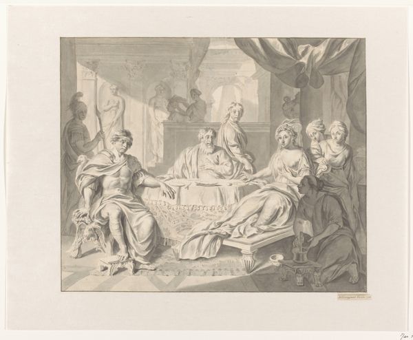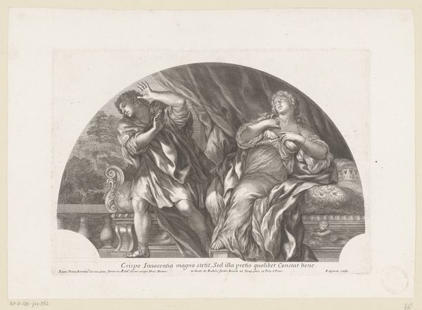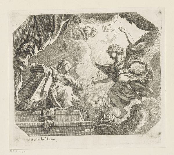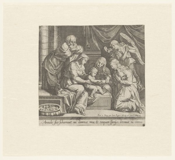 This is Antoine Garnier’s “Mystical Marriage of St. Catherine,” an engraving of the 17th century now held at the Rijksmuseum. It depicts a scene of divine betrothal between the infant Jesus and St. Catherine. Considered within its social and cultural milieu, Garnier’s work provides insight into the religious and artistic conventions prevalent in 17th-century Europe. France, at this time, was deeply rooted in Catholic traditions, and religious themes were common in art. This print reflects the period's emphasis on piety, virtue, and the sacred rituals of the Church. The iconography and symbolism are drawn from established Christian narratives, serving to reinforce religious doctrine and inspire devotion among viewers. The work also speaks to the patronage system of the time, where artists often relied on the support of religious institutions or wealthy individuals for commissions. Historical research into period documents, theological treatises, and art historical scholarship can help us to understand these social and institutional contexts, revealing the complex interplay between art, religion, and society in Garnier’s time.