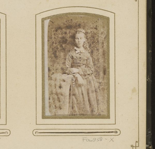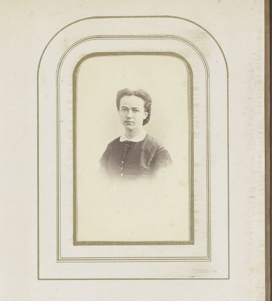 This is Louis de Laetre's portrait of a seated young woman. The photograph, with its modest dimensions, compels an intimate viewing experience. Notice how the muted sepia tones contribute to the subject’s serene composure. The composition centers on the sitter, framed by the chair's decorative spirals, creating a visual rhythm that leads our gaze to her calm expression. De Laetre’s choice of monochromatic palette and soft lighting is not merely aesthetic. It serves as a signifier of the sitter's social standing within the rigid class structures of the time. The delicate balance between light and shadow subtly models her form, while the texture of her clothing hints at both opulence and constraint. Here, we observe a dance between surface and depth, where the formal elements reflect societal expectations, yet invite questions about individuality. These visual tensions remain open to our interpretations today.