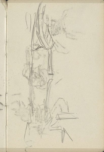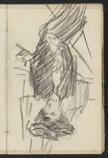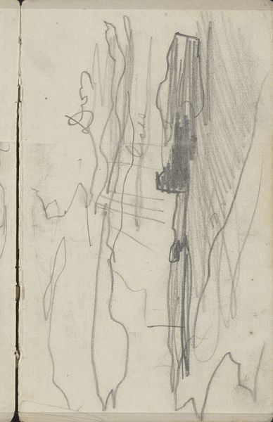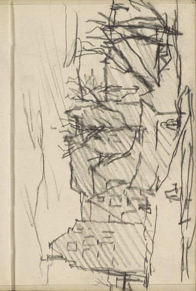 Curator: Before us we have "Gezicht te Amsterdam, mogelijk nabij Prinseneiland," or "View in Amsterdam, possibly near Prinseneiland." It’s attributed to George Hendrik Breitner and likely created between 1907 and 1911. The work is a graphite drawing. Editor: My first impression is a sense of fragmented reality. The composition feels very raw and immediate, almost like a fleeting memory captured in graphite. Curator: That raw quality is quite characteristic of Breitner. He was very interested in capturing the energy and dynamism of the modern city, and this sketch seems to encapsulate that perfectly. His ties to Impressionism underscore a break with formal representation. How might the title help clarify your feelings about the subject? Editor: Well, knowing it's Amsterdam and potentially near Prinseneiland makes me think about the city’s history as a bustling port. The sketch now feels like an echo of that industrial past, the angular lines resembling the skeletons of ships and warehouses. The sharp lines have a coldness, maybe reflecting long winters? Curator: Absolutely. Breitner was keen to represent Amsterdam as a working city, not just a picturesque postcard image. Prinseneiland, historically a center for shipbuilding, provided him with a wealth of industrial subjects that mirrored the image he was carefully building. I imagine viewers at the time thought it challenged perceptions of how cities should be represented. Editor: There’s definitely a powerful sense of place evoked by the drawing, even if it's not immediately obvious what we’re looking at. I sense symbols of transience and impermanence... fitting considering graphite is erasable and therefore transient itself. The imagery of this location feels significant given the importance of sea trade to the development of Amsterdam itself. Curator: Breitner embraced photography as well, and that influenced his sketch work; consider this as something of a snapshot, a study focusing more on capturing an atmosphere than a precise depiction. His engagement reflects changing artistic attitudes regarding new possibilities of representing a subject. Editor: So, the apparent incompleteness reinforces that snapshot aesthetic; we are left to piece together the symbols of industry ourselves and conjure that bustling atmosphere from the skeletal lines. For me, it’s about that psychological impact: how it evokes this sense of a specific time and place without spelling it out literally. Curator: I think the power of Breitner's art, evident even in this sketch, lies in how he democratized artistic subjects. He chose to depict daily life in a style that embraced new mediums while provoking the accepted understanding of the purpose of art. Editor: Indeed. And that simple but evocative use of graphic representation leaves me thinking about the layers of memory embedded within seemingly unremarkable locations.