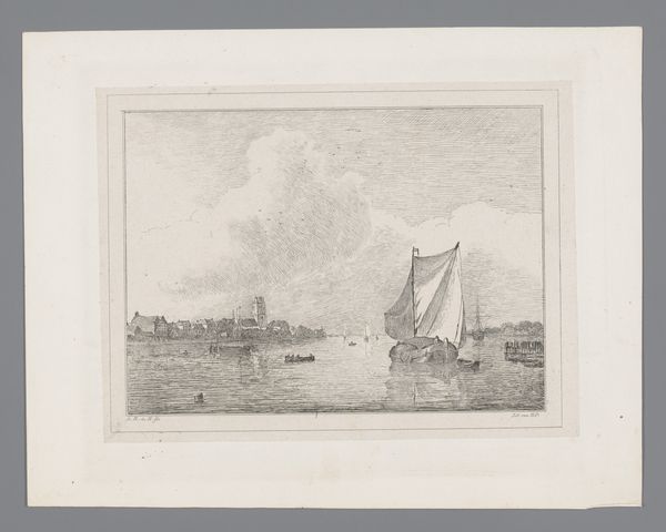 Curator: Here we have Johannes Kö̈rnlein’s "River View with a City in the Background," created between 1765 and 1772. It’s a lovely example of a cityscape rendered with pencil and watercolor. Editor: Mmm, light reflecting off the water… There’s such tranquility in the muted tones; it’s as if time has slowed down. I feel an almost melancholic connection to the past, observing those tiny sailboats gliding towards the barely visible skyline. Curator: Indeed. Note Kö̈rnlein’s calculated use of line and tone. The layering effect he achieved with such delicate pencil strokes really constructs spatial depth—the precise rendering of the boats’ rigging compared to the softer indistinct lines indicating the city. Editor: That almost hazy rendering creates such atmosphere, doesn't it? The precision versus the ambiguity—like memory itself. I wonder, was the artist deliberately playing with perception, creating something factual yet also wonderfully elusive? Curator: The structure of the drawing seems intentionally organized to highlight that. Consider the visual division presented by the water and the skyline. There's a semiotic suggestion of boundaries; not only within the piece but between what the individual observer perceives versus the external world. Editor: It really captures that liminal space. The water acting as a mirror reflecting a changing world. Those tiny human figures aboard the sailboats—they are utterly dwarfed, becoming at one with this immense scenery! Curator: Yes! A formal reduction to the picture plane would read the horizon as an exercise in creating balance. It almost equally distributes spatial planes, forcing your attention to go across not simply *into* the art piece. Editor: But the soul wants to get *into* it, right? I envision myself in one of those sailboats, gliding slowly toward the misty promise of the city, becoming small, yet completely part of the world around. Curator: A subjective projection— but consider how that perception stems from the carefully constructed structural arrangements— how lines draw the eye and muted colors stir certain responses... Editor: Okay, point taken. What initially seemed simply calming is definitely more calculated... This drawing contains levels that definitely transcend simplistic depiction. Curator: Exactly. Art demands engagement through considered formal analysis. And perhaps that little dive you took... the splash you made on entry—helps bring some of this forward!