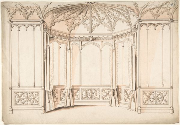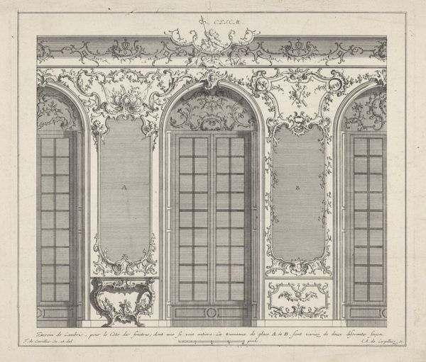 Johann Jakob Arhardt created this print of the choir screen inside Strasbourg Cathedral sometime in the 17th century, using etching techniques. The image gives us a clear, precise rendering of the screen, dividing the space of the cathedral. Consider the craft involved: the artist carefully manipulates line and shadow to replicate the screen's architectural details and sculptural adornments. Each line etched into the metal plate demanded skill and precision. We see the repetition of geometric forms, the arches and quatrefoils, alongside the individualized figures of saints. The print mirrors the labor-intensive process of the stonemasons who originally built the screen. This work, like many prints, served a documentary function, making the cathedral's design accessible beyond its physical location. It speaks to the social context of the time, where the Church held significant power, commissioning elaborate structures to inspire awe and reverence. By focusing on Arhardt’s meticulous etching process, and the subject’s original construction, we gain insight into the intersection of artistic skill, religious expression, and the social hierarchies of the 17th century.