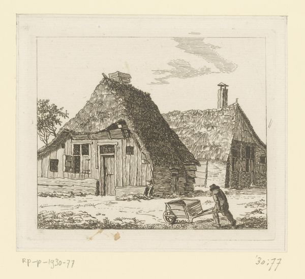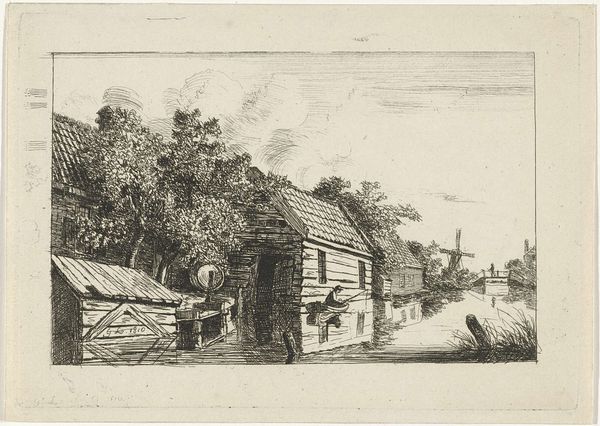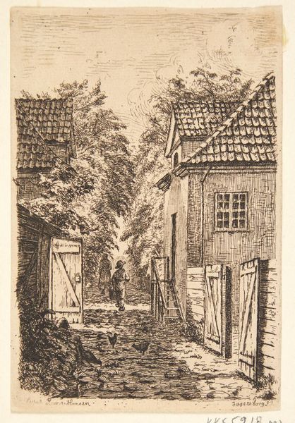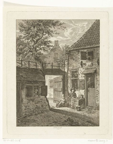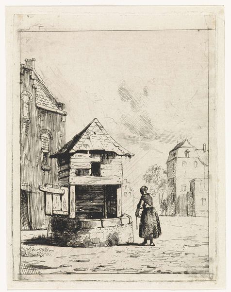 Editor: This is an etching, engraving, and drawing printed as one artwork titled "Binnenplaats met vrouw die trog vult bij hok van dier," made sometime between 1807 and 1855 by Johannes Alexander Rudolf Best. I notice it captures a quiet, domestic scene with remarkable detail, yet there's a palpable sense of labor. What stands out to you about this piece? Curator: I see this piece as a powerful commentary on the lives of women in the 19th century, specifically the intersection of their labor, their environment, and their social roles. Look at how the woman is positioned within the composition; she’s almost framed by the architecture and the animal's enclosure, isn’t she? Editor: Yes, almost confined by it. Curator: Exactly! Consider this in the context of burgeoning industrialization. While cities were changing rapidly, much of the population, especially women, remained tied to traditional, often arduous, forms of labor in more rural settings. The artwork prompts us to question, whose stories get told during periods of immense social and economic change, and who remains unseen? What power dynamics are at play when we look at this scene of labor? Editor: That's fascinating. I hadn't thought about it in terms of social commentary. So, by focusing on this seemingly mundane scene, the artist might actually be drawing attention to a larger societal structure? Curator: Precisely. This “genre painting," as it’s categorized, is more than just a snapshot of daily life. It uses realism to ask critical questions about gender, class, and the hidden labor that sustains society. It’s not just about what is depicted but about what it signifies within a broader political and historical framework. What did you notice about the animals place in this scene? Editor: They look very cramped in a tiny stall made out of simple, wooden boards. And I'm beginning to think it underscores a commentary on unseen or undervalued labor within a society undergoing significant transformations, but I had only been looking at the female subject until now. Curator: The beauty of art is how it offers a nuanced lens to view historical dynamics. Thank you, it's good to know the recording can help others see this image differently as well.