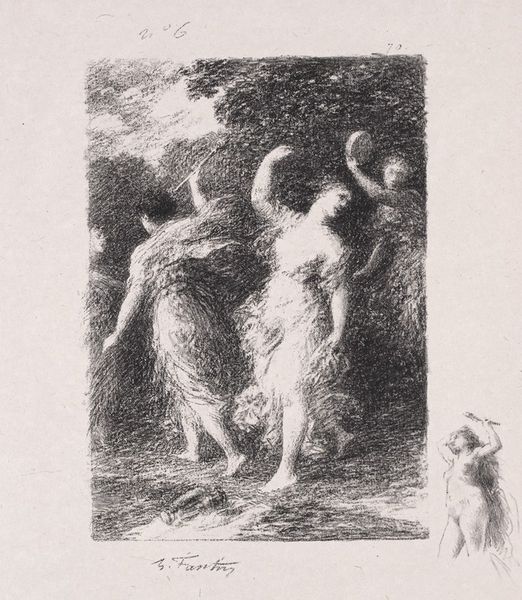 Editor: This is "La jeune Tarentine," created in 1903 by Henri Fantin-Latour, rendered in pencil and charcoal. It feels so ephemeral, almost like a dream. What strikes you about it? Curator: Immediately, the emphasis on process stands out. Look at the visible hatching, the layering of pencil and charcoal. This isn’t about illusionism, but about revealing the artist's labor, the very act of making. How does this choice of medium influence your understanding of the figure depicted? Editor: I hadn't thought about it that way, but now I see how the rough, almost unfinished quality adds to the dreamlike quality. Does that choice reflect anything about society at the time, or Fantin-Latour's place in it? Curator: Absolutely. Fantin-Latour was operating at a time when academic painting still held considerable sway. His choice to create a symbolic nude using humble materials like charcoal challenges that hierarchy. Consider, too, that the "nude" was a historically loaded subject – what is he communicating here with this approach? Is it about making classical ideals accessible, or subverting them altogether through his distinct style and emphasis on the materiality of the work? Editor: So, the work is not only portraying a figure, but also making a statement about artistic production itself, about craft. That's really interesting! Curator: Precisely. It elevates the act of drawing to a space previously held for paintings only, effectively disrupting traditional definitions of what constituted "high art". Hopefully now, considering materiality helps unlock broader readings. Editor: Definitely! It changes how I see the artwork. Thanks. Curator: Likewise. There is so much more to examine beyond the immediately visible.