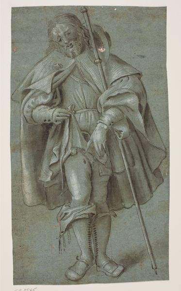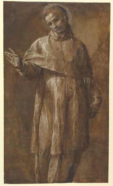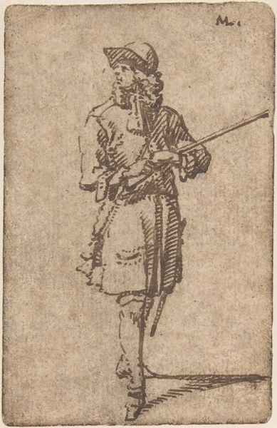 Antonio Vivarini created "Standing Youth with Sword and Palm Branch" using pen and brown ink with brown wash. The monochromatic palette of browns and tans immediately sets a somber, contemplative tone. The figure is constructed through careful hatching and cross-hatching, building up volume and shadow with a limited tonal range. Vivarini uses line to define the figure's contours, which creates a sense of depth. The composition has a static quality because the figure is frontally posed and evenly lit. He seems caught between action and repose. The inclusion of the sword signifies readiness, yet the palm branch, a symbol of peace or victory, softens the image and presents a duality that invites deeper exploration. The formal choices may reflect an understanding of semiotics, using recognizable visual symbols. The limited palette and focused, somewhat subdued composition, underscore the nuanced intersection of form and symbol. This tension invites continuous analysis and keeps this work relevant.