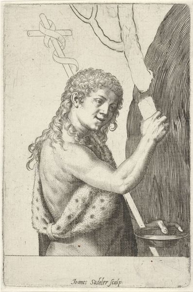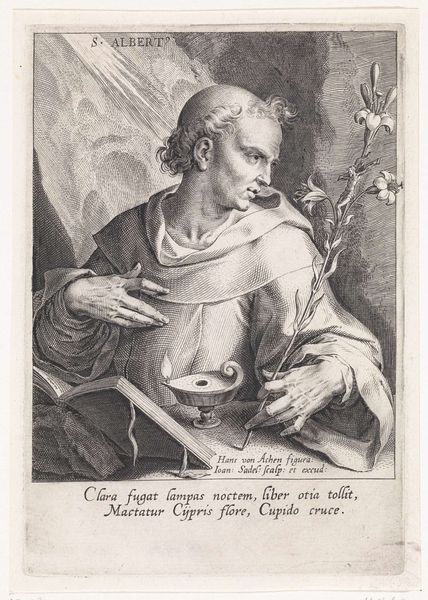 Curator: Looking at this engraving titled “Het Gehoor,” or "The Hearing," crafted sometime between 1673 and 1694, I am struck by the performative nature of how sensory experience was captured. Editor: Immediately, I notice how cluttered the composition is; it feels busy for a single figure. The feather headdress practically screams opulence. What do you make of the way that musical notation is handled? Curator: It’s indicative of the baroque era’s penchant for elaborate allegory, in this case personifying hearing. The presence of musical instruments alongside the musical notation on the desk certainly points us towards sound, as do the cherubs nestled below. It creates a narrative beyond just the individual portrayed. The individual, perhaps an aristocrat based on clothing conventions of the era? Editor: Exactly. See the way the individual is framed against the heavy drape behind? Even the jug on the desk participates, reflecting light in a way that centers them as part of the aristocratic class. Notice, also, the bow connecting a small sculptured man on the desk. The visual echoes between the primary male figure and this miniature statue beg a series of questions. Does that bow connect them? Does it bind the individual to musical hearing itself, almost creating an altar-like offering? Curator: That interplay reveals the fascinating societal dynamic present in Dutch Golden Age portraiture, a kind of constructed image tailored for a specific audience and to reinforce social standing. One must remember, that portraiture, during the 17th century, served many societal functions, marking occasions or as visual cues as indicators of political and cultural power. Here in the Rijksmuseum, we have endless examples of this. Editor: You're right, it goes far beyond mere aesthetics. When we start unpacking all the levels of symbolism, and you look beyond the initial image of a person making music, we find complex social meanings regarding sensory awareness and performative identity in 17th-century Dutch society. Curator: Precisely. This particular engraving speaks volumes not just about auditory perception, but about the visual representation of social structures and cultural values within a very specific historical moment. Editor: Yes, this baroque personification makes one think about not just sensory information, but social memory. I now look forward to reflecting more deeply on the piece's resonance with period ideas around individual identity and place within 17th-century Dutch culture.