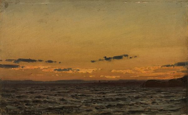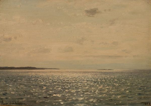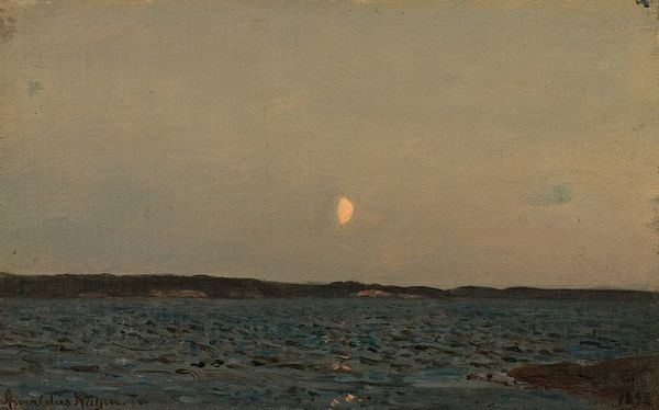 Editor: So, this is Amaldus Nielsen's *Augustmåne*, painted in 1886, using oil on canvas. It's a pretty simple scene—water, land, and a moon—but something about the muted tones makes it feel quite heavy and still. What do you see in it? Curator: I see the moon, of course. Not just as a celestial body, but as an ancient symbol. Think about its presence in mythology, folklore. Cultures have long imbued the moon with notions of cyclical time, feminine energy, and the subconscious. In Nielsen's *Augustmåne*, its dim light seems to cast a spell, inviting introspection. Editor: Introspection, definitely. I was thinking about how that line of light reflects from the moon. Is that typical for seascapes of the time, or is there more to that one visual choice? Curator: It's not unusual for seascapes to depict the moon's reflection. However, note its character here. The artist employs a broken, flickering reflection, disrupted like a broken promise, not a clear path. Consider it a symbol of humanity’s fractured relationship with nature. Or perhaps it reflects the fleeting nature of a moment. Editor: That's interesting. So, rather than just a literal depiction of light, it's a kind of melancholic emblem? Curator: Precisely! Nielsen doesn't simply show us a scene; he evokes a feeling, laden with symbols and archetypes. It bridges the visual and emotional worlds. Editor: I'm starting to see how even a seemingly simple image can hold layers of meaning. I guess there's so much more than just what is immediately apparent. Curator: Indeed. By examining the enduring power of symbols, we find a dialogue between ourselves and our shared history, a connection we can revisit anytime.