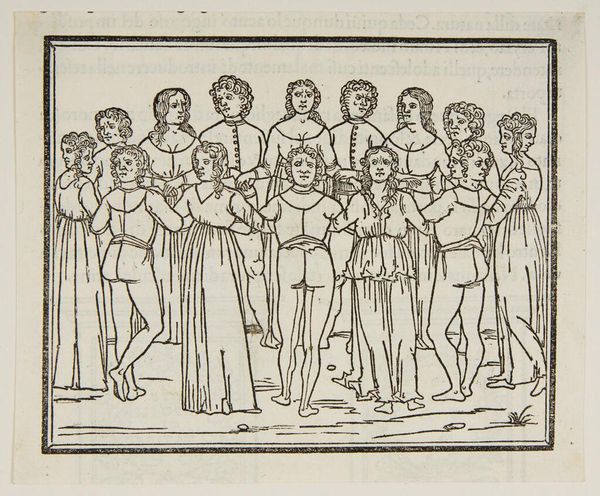 Curator: This woodcut, whose title is "The priestess enthroned, with five nymphs surrounding her. Poliphilus and Polia are kissing each other in her presence", depicts a scene that feels both ceremonial and secretive. Editor: The first thing I notice is the spatial tension—the foregrounded kiss versus the enthroned priestess in the middle-ground. It feels like a challenge to established power structures, doesn't it? Curator: Absolutely. The kiss, in its direct emotionality, becomes a visual symbol for something potentially disruptive to the priestess’s authority. We see a visual allegory of power and desire, perhaps? Editor: Or even a comment on sanctioned versus unsanctioned love? The priestess, rigid and central, versus the lovers freely embracing on the periphery. It reads like a layered statement about societal constraints. Curator: A beautiful thought. Ultimately, what resonates is the enduring human impulse to connect, to love, and to, perhaps, question the order of things. Editor: It leaves me pondering how visual narratives, even in this small woodcut, can hold such complex reflections of our shared experiences.