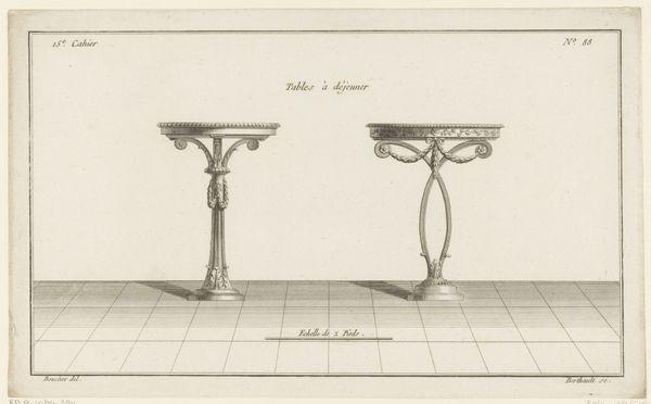 Editor: Here we have Pierre Gabriel Berthault's engraving, "Vierkante en ronde tafel," or "Square and Round Table," created sometime between 1772 and 1779. The depiction feels so precise, almost mathematical. What captures your attention most about this piece? Curator: Funny you mention math. This isn’t just about furniture; it's a glimpse into the Neoclassical mind. Everything is about order, reason, and an idealized past. That precise engraving you noticed? It's practically a blueprint, echoing the architectural drawings popular then. Editor: So, it's less about, say, the cozy feel of a table, and more about the ideal *form* of a table? Curator: Exactly! They wanted to bring back the grandeur of ancient Greece and Rome, even in something as simple as a breakfast table design. You can almost feel the echoes of temple columns in those straight lines and restrained decoration, can't you? It's funny, isn’t it, how much philosophy you can cram into a tiny drawing? Editor: I definitely see it now! The clean lines and almost… sterile look of it. It’s not exactly inviting, but it *is* impressive in its clarity. Curator: And isn't that telling? That shift from 'inviting' to 'impressive'. It signals a whole world of change in how people thought about art, design, even their own place in the world. Think about it, what does furniture design suggest to you? Editor: Well, I initially focused on the tables themselves, but now I realize it speaks volumes about the values of that era. Thanks, I am actually quite thrilled now. Curator: Glad I could unveil some nuance into such practical geometric forms! It just goes to show: even the humblest object can whisper secrets from the past.