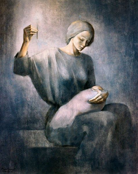 Curator: Diego Rivera's oil painting, "Portrait of Ruth Rivera," completed in 1949, presents a compelling composition. Editor: The immediate impact is striking; the draping white fabric seems almost sculptural against the warm, muted palette, doesn't it? It commands attention. Curator: Indeed. Observe how Rivera masterfully manipulates light and shadow to define form. The composition hinges on a fascinating dichotomy; one figure directly confronts us while the other, seemingly a mirrored reflection, gazes outwards. Consider also how this structure alludes to the cultural emphasis on mirroring, doubles, and ancestral lineage that underscores Rivera's vision. Editor: And what's truly remarkable is how that cultural significance extends beyond mere aesthetics. As a historian, I am inclined to explore Rivera's social and political engagement in this work. Curator: Absolutely. Beyond its visual merits, one cannot ignore the societal context in which the portrait exists, especially regarding gender representation and the role of women within artistic and historical discourses. The depiction hints at the traditional muse-artist relationship, inviting commentary on societal expectations. Editor: That’s right. Ruth Rivera herself was an architect, defying many societal constraints. By situating her within a classical, almost Grecian context—the flowing white robes are particularly evocative—Rivera might be making a statement about timelessness and the enduring power of the female spirit, even within historically restrictive cultural structures. Curator: From a formalist standpoint, it's compelling to consider how those cultural readings interact with the painterly application and structural aspects. The interplay between form and content generates additional interpretive complexity. Editor: Exactly. It shows how aesthetic choices can profoundly engage with social and political narratives. This portrait urges us to reflect not only on the artwork itself but also on its societal and cultural implications, prompting us to engage with those layers and complexities more critically. Curator: Indeed, a testament to Rivera's mastery of form and his contribution to the politics of imagery. Editor: It is also a good instance of how artworks challenge prevailing views on femininity and heritage.