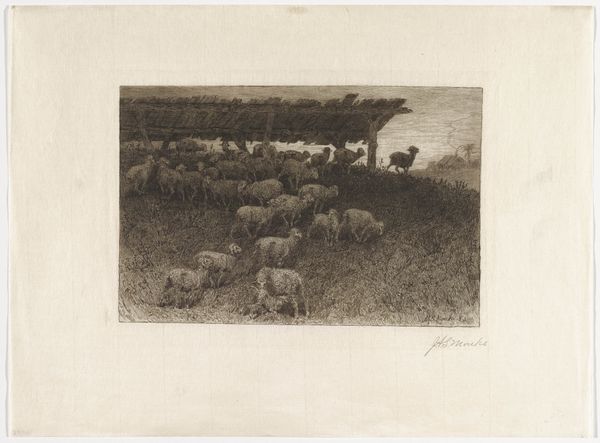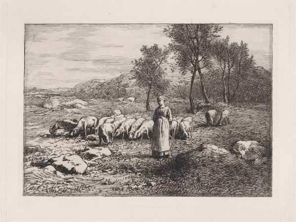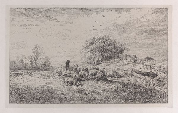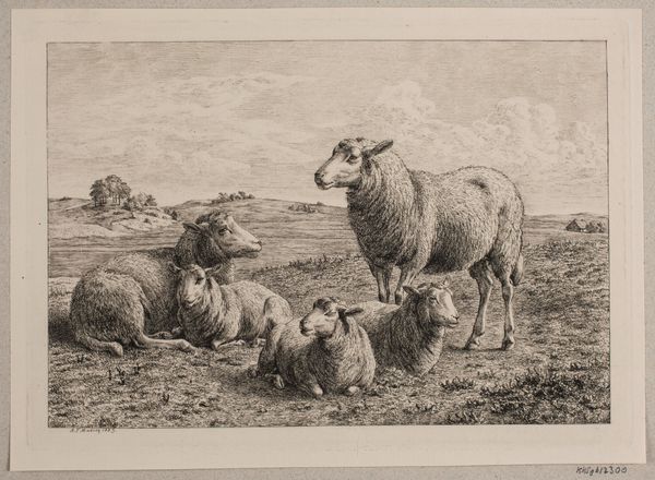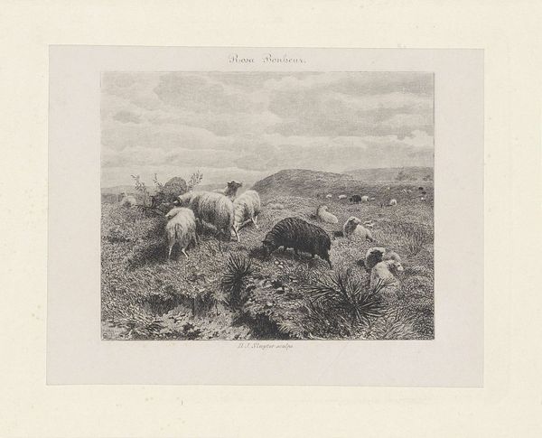 This engraving, 'On the Hill Side' from "The Art Journal", was created by William Holman Hunt in 1852. The tonal variations create a sense of depth and texture that draws us into a seemingly tranquil landscape. The composition is structured around a high horizon line, with a dense cluster of sheep dominating the upper right quadrant. This arrangement creates a certain tension between the particular and the general. The individual sheep are rendered with careful detail, yet they form a collective mass, suggesting a broader commentary on society and individuality. The contrast between the solid land and the distant, fluid sea introduces a dichotomy between the tangible and the infinite. This print invites us to consider the relationship between humanity and the natural world, and the interplay between detail and the abstract qualities that define our perception of reality.