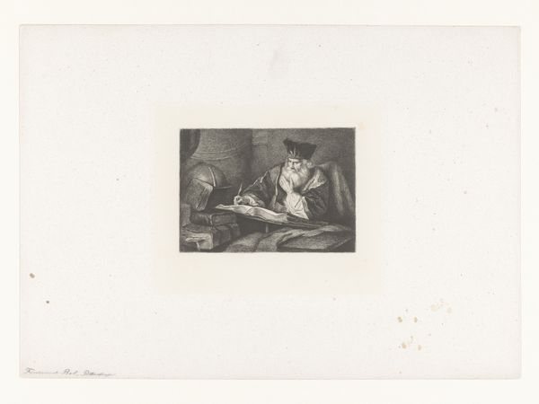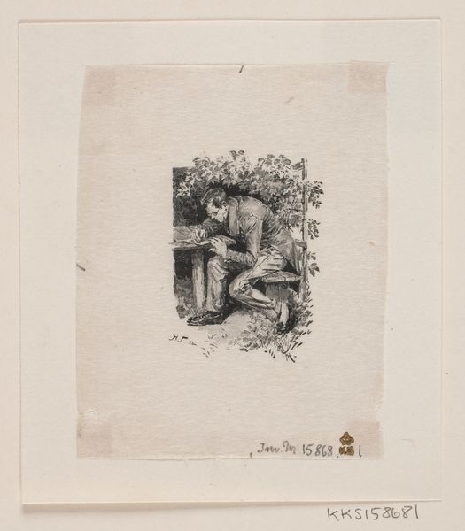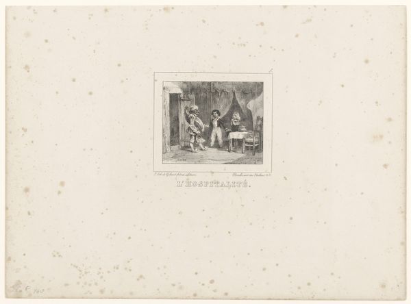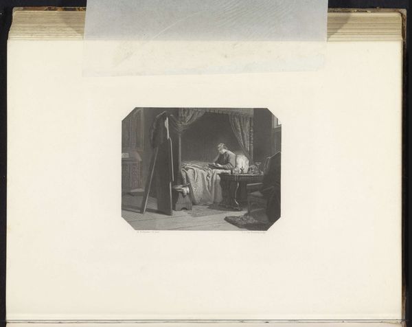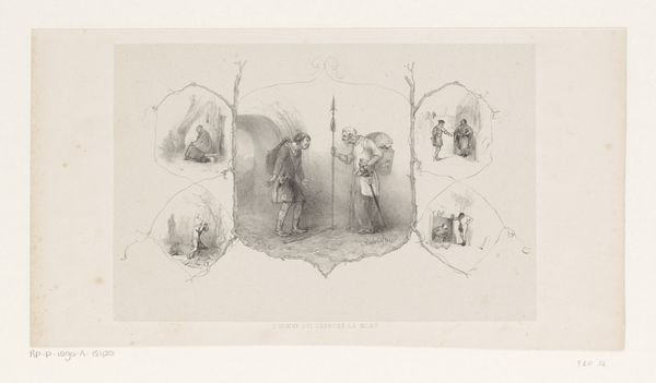 Editor: This drawing by Charles Rochussen, titled "Vrouw op balkon kijkt naar lichaam dat binnen wordt gedragen" or "Woman on a balcony looking at a body being carried inside", dates back to before 1842. Executed in pencil on paper, it feels like a glimpse into a theatrical tragedy, like we're seeing a single panel in a storyboard for something larger. What jumps out at you when you look at it? Curator: What jumps out? Well, I’m struck by its quiet intensity. There’s a certain... softness, even with such a heavy subject. It feels like witnessing a memory, perhaps a cherished and painful one. The artist captures the scene, yet frames it with these vignette-like insets to create these different levels of viewing or telling a story in pieces. Why frame a scene with small circles on either side, you know? What is the artist alluding to there? Editor: That’s a lovely interpretation, almost dreamlike. I see what you mean, but it feels a bit like those family crests from long ago, so maybe about family, but also about death or loss as well? Curator: Interesting observation... crests, heraldry... perhaps the artist is suggesting that this personal tragedy echoes a wider societal or historical narrative. The sketch feels like the visual equivalent of poetry, offering us fragments and hinting at broader stories through tone, texture and symbolic arrangement. It prompts us to see the universal in the particular, or the historical resonance of what could be seen as a familiar and current day tragedy. It doesn't necessarily point in one particular direction though! Editor: So, it’s more about the *feeling* of history than any specific event? Curator: Exactly! We're left to connect with those feelings ourselves, letting the artwork become a mirror to our own experiences. Editor: I never would have thought to look at it that way. I initially saw only the surface, but it really makes you wonder what you're actually looking at. Curator: Which I would call "a good start", truly. Because it all ends with you deciding for yourself in the end.