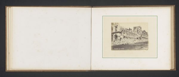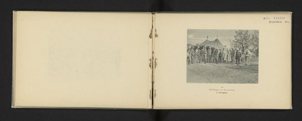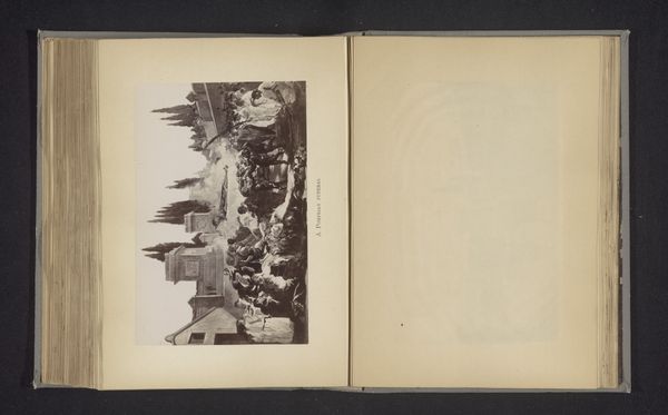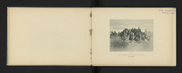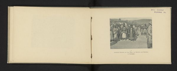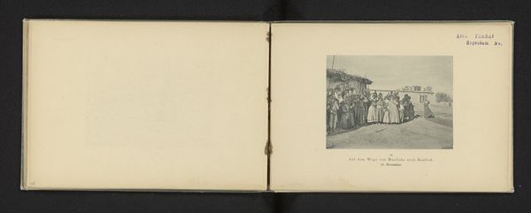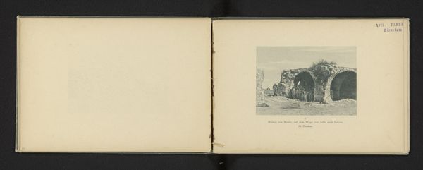 Curator: Let’s turn our attention to this fascinating print entitled “Dancers with Swords on a Square in Damascus, Syria,” created before 1899. It’s an interesting depiction, caught within the pages of what appears to be a travel journal. Editor: It has a certain formality, doesn't it? The carefully rendered architecture creates a strong horizontal baseline, then those rhythmic arches provide visual stability. It makes the dancer, or dancers—I can't quite tell—feel poised, part of a calculated composition. Curator: Absolutely. Considering the orientalist style, the calculated composition also frames the scene to serve European perspectives and fantasies about the 'Orient'. It's important to remember that the power dynamics inherent in the gaze shaped how such scenes were represented. The "dancers with swords," while seemingly celebratory, also reflect Western ideas of masculinity and exoticism. Editor: I agree that a gaze is apparent, but note the placement of the figures within the square, contrasted by the backdrop of what appears to be the Old City. I can't help but wonder about the artist's intentions as a creator. Was the primary focus documentary, seeking an accurate portrayal, or was there a leaning toward the aesthetic possibilities in order and proportion, in line and texture? Curator: These observations aren't mutually exclusive, of course! By placing it in a travel journal setting, it suggests documentation, yes, but also personal reflection—the Empire’s influence as it seeped into personal narratives. And those "aesthetic possibilities" were often guided by prevailing ideologies and cultural biases. The artistry here lies in understanding both the depicted scene and the lens through which it's presented, so consider its creation and function within that power structure. Editor: A potent reminder that the beauty lies not only in the structure but the questions it raises. It truly adds layers to the work that may go unnoticed. Curator: Precisely. It's in wrestling with these contextual layers that the image truly finds resonance with us today, so the power in observation is only truly realized when observation includes reflection on historical awareness.