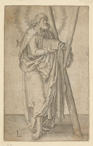 Lucas van Leyden created this engraving of St. Andrew. It is currently housed at the Metropolitan Museum of Art. The composition of St. Andrew is striking, as he stands with his iconic saltire cross. This gives the image a clear, vertical orientation, yet one softened by the saint’s posture and flowing garments. Van Leyden’s delicate use of hatching and cross-hatching brings an almost palpable texture to the print, defining the saint’s voluminous cloak, the rough-hewn wood of the cross, and even the halo that radiates around St. Andrew’s head. It is through this method that the artist captures both form and light, creating a sense of depth on a flat plane. Consider how the formal structure – the lines and textures – evoke spiritual contemplation. The book he holds, the cross he leans on, these aren't just symbols, they are structural elements guiding our understanding of faith and martyrdom. This is not merely an image of a saint, but a carefully constructed meditation on devotion, designed to engage the viewer in a dialogue about belief and representation.