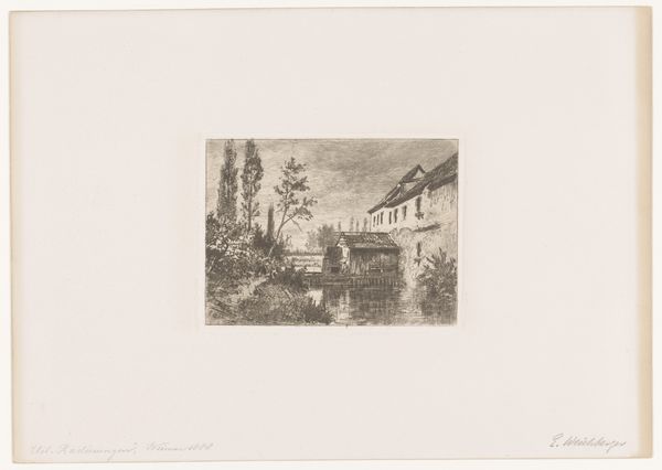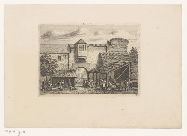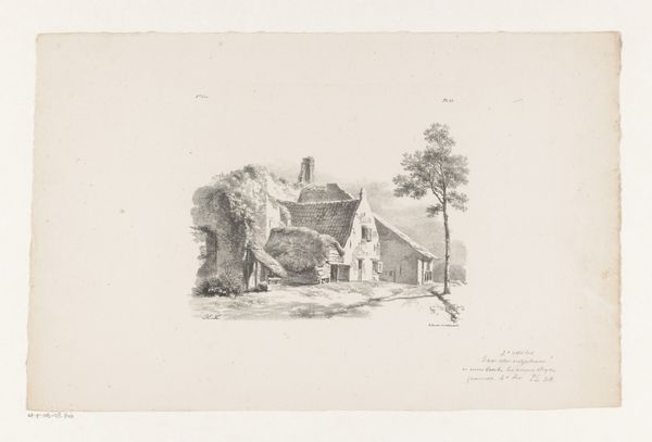 Editor: Okay, next up we have Charles Jacque's etching from 1845, "Landscape with Peasant Home." The detail is astonishing, but there is a strange mood, almost unsettling. There's something about the starkness of the home against the detailed textures of the landscape that feels weighty. What are your initial thoughts when you look at this? Curator: Unsettling is interesting. To me it feels like a stage set – almost aggressively *normal*, in a way that borders on theatrical. You've got your grazing animals, your rustic architecture... Did you happen to notice that crooked flag perched atop the building? It looks so fragile; like one good gust and it’s gone. I wonder what Jacque meant by that detail? Editor: I didn't! It’s so tiny. But a bit broken or unfinished… or maybe even a statement of some kind? Perhaps a critique of rural life, hinting at hardship? Curator: Exactly! Think about Realism as a movement; the move away from Romantic idealizations and grand historical narratives to focus on depicting ordinary life as it *really* was. Here, Jacque’s not giving us sweeping vistas but an up-close and personal view of a humble home. We might almost smell it, you know? The damp earth, the farm animals… How do you feel that contrasts to the romantic landscapes by his contemporaries? Editor: It feels much more grounded. Almost like… evidence. Whereas some landscapes feel designed to impress, this feels designed to show, tell a true story, to depict lives rather than just pretty places. Curator: Absolutely. He takes you right into the thick of it. The artist, or rather, the flâneur if you may, immersing in life, gathering it with his bare senses and transcribing it. Did we stop to feel the silence of the country too? Editor: Yes, thank you for reminding me. It helps give me an idea about the whole situation and I learned that rural scenes, with peasants, in 19th century were no longer purely idyllic representations, but contained social commentary too! Curator: Exactly! Art reflects its time, but more importantly, it resonates and still speaks with ours, if we let it...