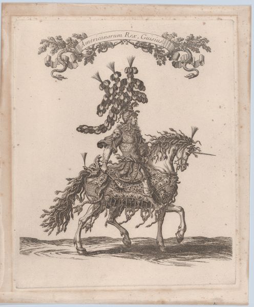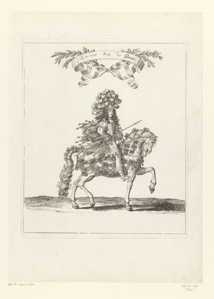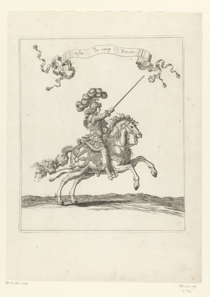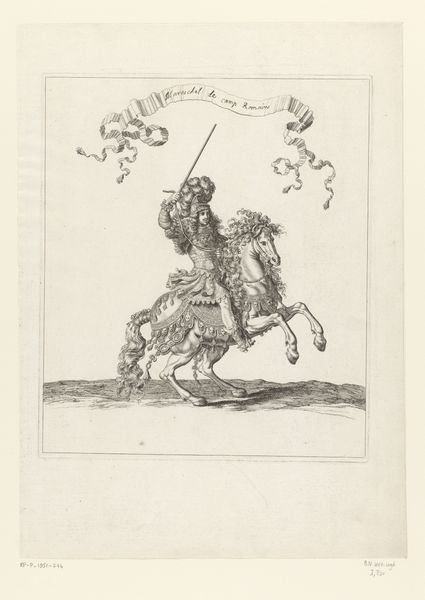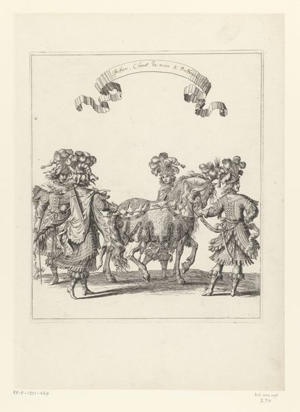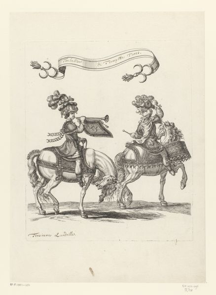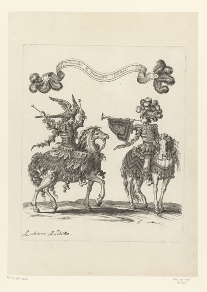 François Chauveau created this print of mounted drummers in Roman costume using etching. This image encapsulates the performative aspects of power in the 17th century. The riders, adorned in elaborate interpretations of Roman attire, are not merely playing music; they're embodying an ideal of imperial grandeur. Etchings like this one circulated widely in France, helping to shape cultural attitudes toward power and spectacle. The choice of Roman costume is significant, evoking the historical weight of the Roman Empire. The print is an artifact, reflecting the aspirations and values of its time. To truly understand it, we might consult period texts on fashion, social customs, and political theory. These resources help us interpret the visual codes that would have been immediately apparent to Chauveau’s contemporaries. The print’s value lies in its ability to open a window onto a distant social and cultural landscape.