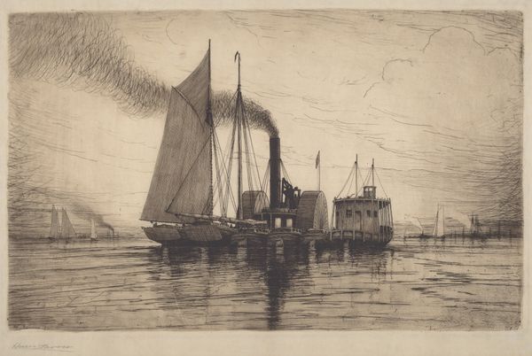 Reginald Cleveland Coxe’s etching presents the New York Harbor in delicate sepia tones, where the Statue of Liberty rises to meet a sky pierced by the assertive plume of a steamship. Here, we see the dawn of a new era. The steamship, a symbol of modernity, evokes the relentless march of progress, its form reminiscent of ancient depictions of sea monsters or dragons, now tamed by human ingenuity. Observe how the steamship mirrors the posture of the Statue of Liberty. The statue, standing tall, offers a stark contrast, harking back to classical ideals of liberty and enlightenment. It echoes the ancient Roman goddess Libertas, yet here, she is reborn as a beacon for the modern world. This is not just an image of a harbor; it's a stage where past and present collide, engaging our subconscious with the potent symbolism of freedom and progress. These symbols create a tension between historical aspirations and the dynamic forces reshaping our world, capturing the emotional and psychological complexities of the era. The statue and the steamship engage in a symbolic dance, forever bound in the collective memory of a world in flux.