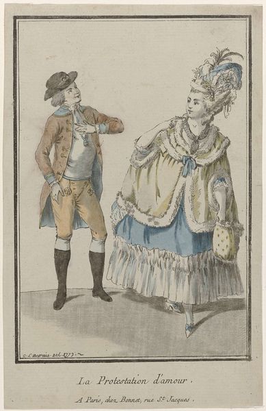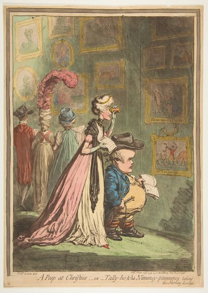 Editor: This hand-colored etching from around 1800-1810 is titled "Le Chinoise de Province et son Magot," and it’s by an anonymous artist. The subjects’ clothing and scale feels intentionally awkward. What strikes you most about this piece? Curator: Certainly, it is through deliberate composition that the artist foregrounds certain elements, manipulating them to achieve particular effects. Note the interplay between the verticality of the playbill-covered wall and the pronounced curve of the female figure's extravagant skirt. How might that relationship shape our perception? Editor: It almost makes the woman seem wider, exaggerating her form. Also, her outfit clashes with the more muted tones of the man’s attire and the city backdrop. Does this suggest anything about social commentary in the print? Curator: Precisely. The disharmony in color and line suggests a purposeful disjunction, an invitation for the viewer to contemplate not just the individuals depicted but their relationship to their environment. Consider the semiotics of dress here; each element, from the towering headdress to the precisely rendered buttons, speaks volumes about societal values. Editor: So the exaggeration, the awkwardness… it's all contributing to a commentary on the individuals within their society? Curator: Precisely. And note also that we decode Romanticism differently as our perspective on class, fashion, and race evolves. Do we interpret the image with new critical methods or by simply recontextualizing older formal elements? Editor: That's a great point. I learned to consider how deliberate choices can contribute to multiple interpretations and societal critiques within one piece. Curator: And for me, the beauty lies in continuously interrogating our own formal methodologies, refining how we see the world through art.