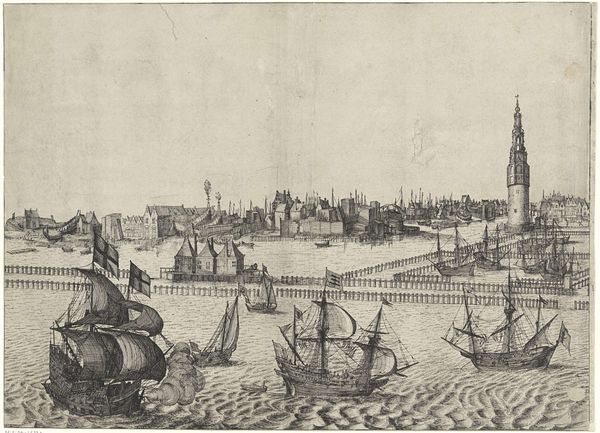 Curator: The intricacy of this engraving, simply titled *Aankomst van Maria de' Medici in Rotterdam* or, *Arrival of Maria de’ Medici in Rotterdam*, from 1639, completely overwhelms me! The detail is just stunning, isn’t it? Editor: It certainly does offer a comprehensive overview, but my immediate sense is one of almost oppressive density. So many rooftops, so many masts—a visual metaphor, perhaps, for the complex political landscape surrounding Maria de' Medici? Curator: Exactly! This piece gives us such a fantastic glimpse into Dutch Golden Age society, shaped by figures like Medici, an important political mover of her time, not just a figurehead. How do you read the imagery surrounding her arrival itself? Editor: Given Medici's tumultuous relationship with France and her eventual exile, the celebratory nature feels laden with irony. The mass of onlookers feels more like a control mechanism when thinking about how women of power were received during that era. Does the cityscape overwhelm the figures deliberately? Are we supposed to feel a sense of unease amidst this seeming triumph? Curator: Precisely the questions we should be asking! Maria de’ Medici constantly dealt with controlling narratives—her power mediated through male advisors and family members. Considering intersectional gender and power dynamics, Rotterdam’s overwhelming presentation diminishes Maria’s importance on several fronts, right? Even nature’s represented in great swathes as great billowing cloud formations Editor: Absolutely. Think about the way landscapes are used—particularly cityscapes. Here, Rotterdam isn't merely a backdrop; it's a player. Anonymous engraver highlights not just Medici's arrival, but Rotterdam's wealth and stature, secured through complex global trade relationships. This work reminds us that art served multiple agendas in the 17th century, bolstering civic pride and conveying a broader political message while ostensibly commemorating an individual. Curator: That is very insightful, by carefully mapping those socio-political relationships within that space. Perhaps, more work in the frame, or indeed out of it! This offers critical reflection that art continues to encourage. Editor: A fittingly layered departure point, considering all we've seen today!