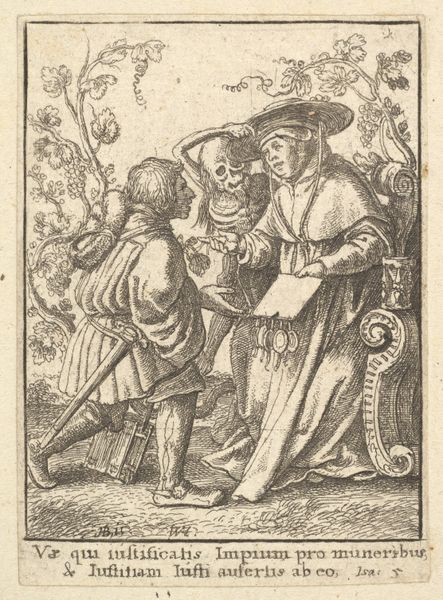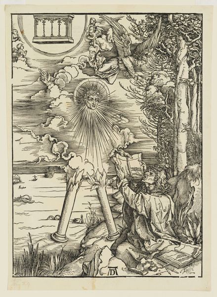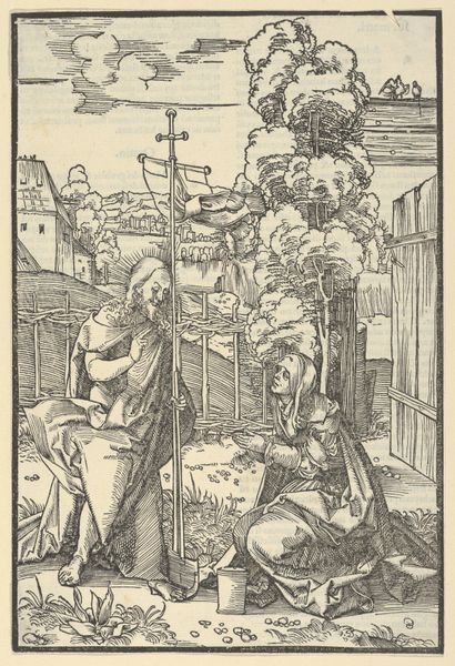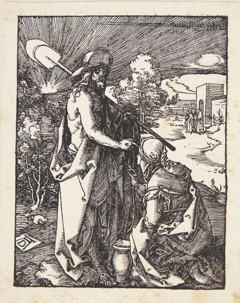 Marcantonio Raimondi created this engraving, "Christ Appearing to the Magdalen as a Gardener, after Dürer," around the early 16th century. The composition is structured by contrasts in light and texture, creating a reverent emotional experience. Raimondi masterfully employs the graphic language of line to define form and space. Notice how the density and direction of lines articulate the play of light across Christ’s figure, distinguishing it from the more subtly rendered form of the kneeling Magdalen. The cross-hatching technique not only models the figures but also suggests a tension between the earthly and the divine. This tension is mirrored in the juxtaposition of textures, from the smooth skin to the coarse fabric. The relationship between line, texture, and form encourages a dialogue about the intersection of the sacred and the material world. The print challenges our understanding of Christ’s transformation, urging us to consider the semiotic interplay between the visible and the invisible, the earthly and the spiritual.