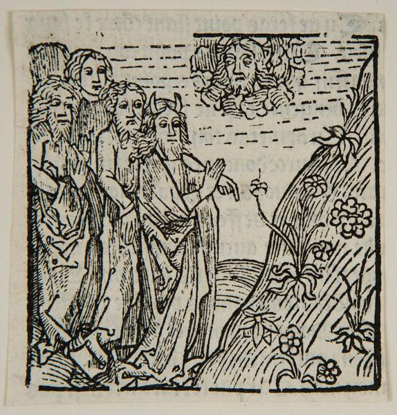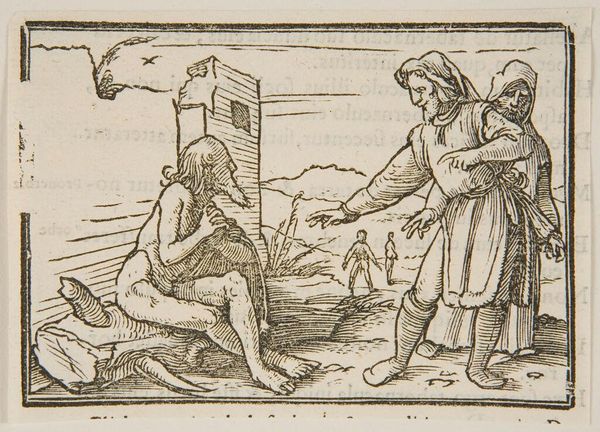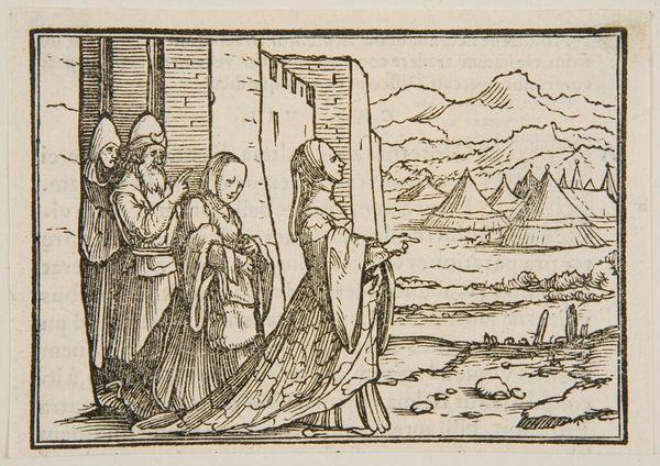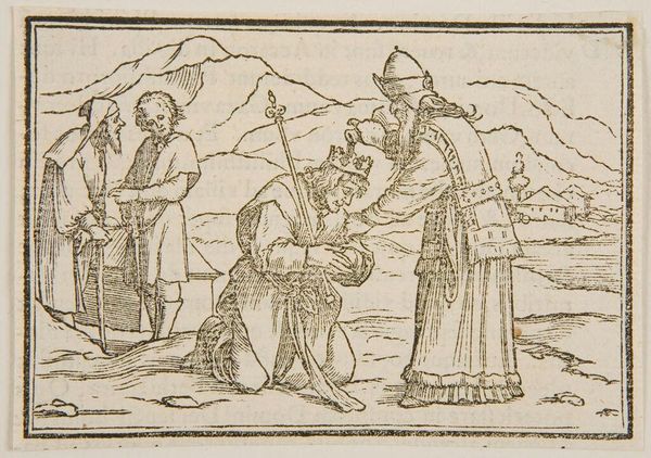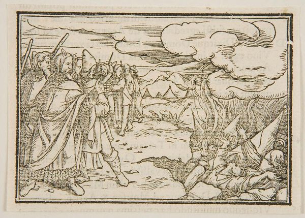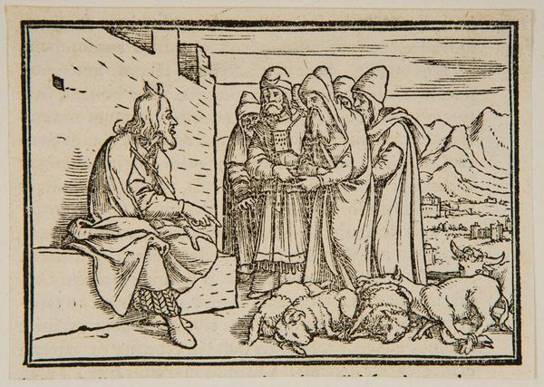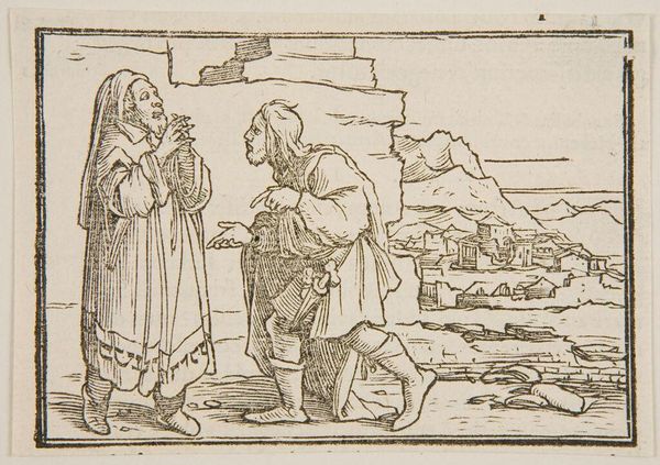 Curator: Hans Holbein the Younger, who died in 1543, created this woodcut, titled "1 Sam. XXIII", now housed in the Harvard Art Museums. Editor: The raw, linear quality of the printmaking brings a starkness to the scene. The King seems to be caught in a moment of dramatic tension. Curator: Holbein's Protestant sympathies and humanist learning deeply informed his art, often examining power, piety, and the individual’s relationship to authority. Editor: Right! There is definitely something theatrical here, like characters on a stage, the backdrop is more symbolic than real. It's a very striking work. Curator: The limited tonal range of the woodcut only enhances the themes of power and moral conflict central to the biblical narrative. Editor: Absolutely. Thinking about that King with his outstretched hands, I wonder if the artist is portraying doubt or a blessing? It's wonderfully ambiguous.