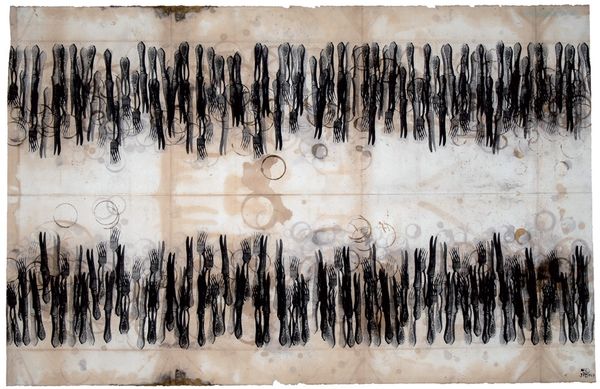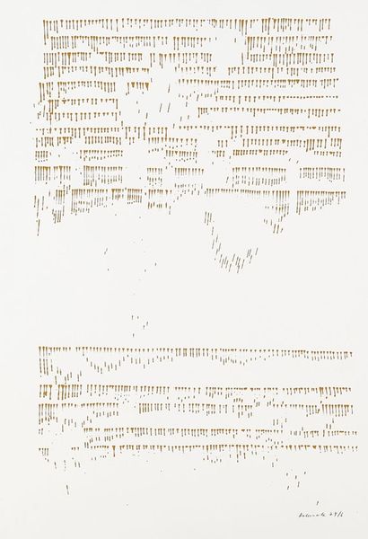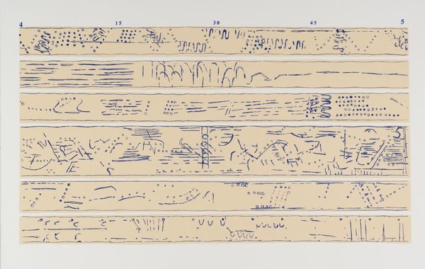 This is an undated, untitled work on paper by the Romanian artist Ion Bitzan, made using an inky medium. Bitzan’s work is often situated within the socio-political context of mid-to-late 20th century Romania, a period marked by intense ideological control and censorship. The artwork presents dense fields of what appears to be handwritten text, which on closer inspection, dissolves into abstraction. It evokes a sense of suppressed communication or coded expression. The linear quality and repetitive nature could reference the artist’s internal state. The geometric form, rendered with precision amidst the fluid script, offers a stark contrast, perhaps symbolizing the imposition of order over chaos, a theme resonant with life during oppressive regimes. Bitzan’s work resonates with themes of identity, control, and freedom of expression. What feelings does this work evoke in you?