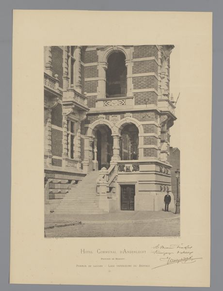 Editor: This photograph, "Hoofdingang van het Laboratorium voor Hygiëne en Farmacologie te Groningen" – or "Main Entrance of the Laboratory for Hygiene and Pharmacology in Groningen" – by Johannes Gerardus Kramer, dating from somewhere between 1875 and 1900, captures a rather imposing doorway. The classical details above the door are striking. What catches your eye in terms of its construction? Curator: Immediately, the Doric columns framing the archway provide a stable, vertical emphasis which counters the horizontal brickwork of the building. The lunette above, filled with allegorical figures, invites an interpretive reading based upon the organization of form. Do you notice the contrast between the solid brickwork and the relative airiness of the carving? Editor: Yes, I see that contrast. The heaviness of the brick definitely grounds the structure, while the carved figures above seem to float or recline in their space. How does the symmetry, or lack thereof, affect the overall composition? Curator: While ostensibly symmetrical, observe the subtle variations in the brick texture on either side of the doorway. These discrepancies imbue the photograph with a quality verisimilitude. Furthermore, consider the gelatin-silver print medium: its tonal range contributes significantly to our appreciation of the surface texture. Editor: So, the interplay between symmetrical form and asymmetrical texture creates visual interest. Curator: Precisely. The photograph uses the door frame as a kind of... a frame within a frame... establishing boundaries but also creating a play between architectural space and representational space. The photograph creates an artwork that is more than the building, yet not entirely separated from it. What, then, constitutes this art work? Editor: Hmm, interesting perspective. I was focusing on the immediate visual impact, but you've helped me think about how the form and materiality influence its meaning. Curator: Indeed, considering form, materiality and visual space are the keys to the essence of an artwork.