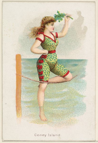 This is a chromolithograph called "Granville", part of the "Fancy Bathers" series, created by Wm. S. Kimball & Co. The image presents a woman in a bathing suit leaning against wooden posts at the beach. Note how the verticality of the posts contrasts with the relaxed posture of the figure, creating a tension between rigidity and ease. The use of color, primarily soft blues and pinks, imbues the scene with a serene, almost dreamlike quality. The composition invites consideration of the relationship between the figure and her environment. Is she confined by the posts, or are they merely a point of support? This ambiguity reflects a broader exploration of women's roles and representations in art and society at the time. The image employs semiotic codes related to leisure, beauty, and femininity, inviting viewers to decode its cultural significance. This simple image, therefore, becomes a site for interpreting shifting social values and aesthetic ideals.