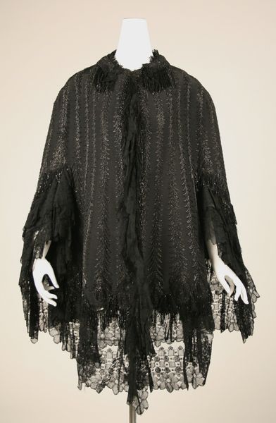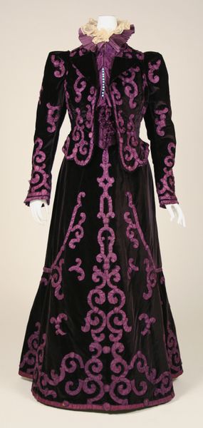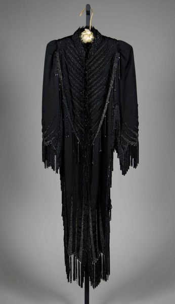 Editor: So, this "Coat" from between 1860 and 1896, created by Emile Pingat, utilizes fibre and textile art. Its elaborate, dark lacework makes it look like something out of a Victorian novel, doesn’t it? How do you interpret the cultural significance embedded within such a piece? Curator: The pervasive black and elaborate lacework is a strong symbol. Considering the era, what emotions do you think the color evokes? Beyond the immediate, what could its presence signify in a deeper cultural context? Editor: It certainly makes me think of mourning. It's such a specific and powerful visual signal. Is that the primary reading? Curator: It's difficult to say if mourning is the only intended symbolic gesture here, but in a world where clothing acted as signifier, color and material became critical. Notice the ways in which the heavy fabric of the coat interacts with the far more ephemeral lace, these two contrasting visuals come to symbolize the solidity of grief with the potential freedom in death and faith. Where might the designer had acquired the symbolism of his designs? Editor: Possibly other forms of mourning clothing through history? Like those elaborate Victorian mourning rituals that became theatrical? Curator: Precisely! The theatricalization of grief becomes a social script acted out in visual terms. Pingat may not simply be recording that script, but is engaging in shaping it, isn't it so? Editor: Yes! And it’s intriguing to consider how such a heavy garment becomes part of constructing and performing an identity connected to grief. Thanks, I never considered clothing beyond aesthetic taste! Curator: My pleasure. And this type of thinking demonstrates the power clothes has in reflecting both societal expectation, and private emotion.