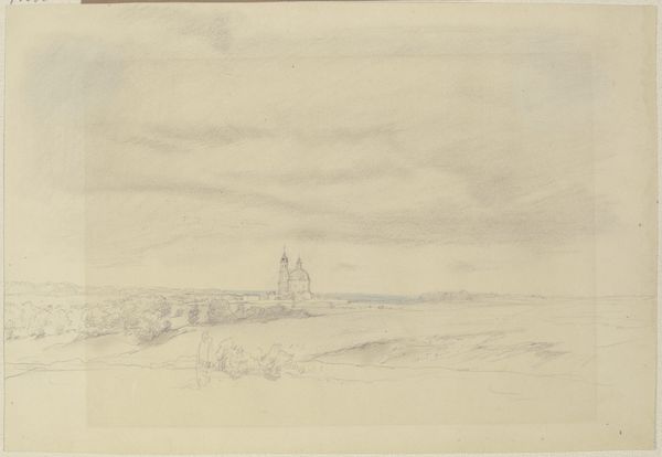 Curator: This is Johann Christoph Erhard’s "Landscape with church," a pencil drawing that dates from 1917. Editor: It's incredibly delicate. It almost floats on the page, doesn't it? Ethereal, even. There’s such sparseness to the composition; the land feels limitless. Curator: Erhard had such a unique talent for capturing the emotional resonance of place. I imagine this view as something personally meaningful, reduced to its purest form by the limitations of the medium—just a pencil. But within this apparent simplicity, there’s complexity. Editor: The horizon line's set unusually high. You feel a definite contrast between this small settlement and an imposing backdrop—suggesting the enduring strength of faith. Yet also making you think about its precarity perhaps, or its relative fragility within a changing landscape. I can't help but consider the socio-political tensions that would've been building at that time... a society on the brink. Curator: Absolutely. There's something stoic about its quietude, though. Knowing the historical backdrop just enhances the underlying poignancy. You mentioned fragility, and I see it too—not just of a physical place but a moment in time—rendered with this gorgeous economy of means. And yet he found enduring power with understatement, suggesting how individuals endure hardship and preserve their traditions and values through even the most tumultuous times. Editor: Yes. Thinking about it now, it’s like a testament to survival... the landscape acting as both witness and refuge. And a reminder that even within grand narratives of war and upheaval, there were these small, steadfast worlds continuing on, holding onto something essential. It almost feels like a political statement. Curator: Beautifully said. It makes you consider not only the scene itself, but your own place in this world. A quiet revolt in pencil, perhaps? Editor: Maybe that's exactly what it is!