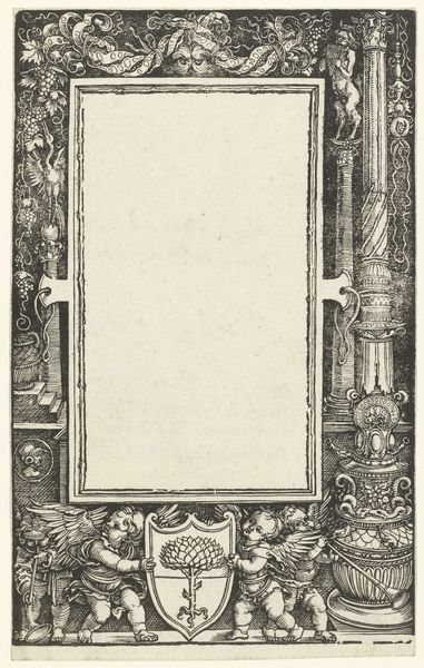 Curator: This print, currently housed here at the Rijksmuseum, is by Giovanni Guerra. Titled "Poort met een gebroken fronton op twee pilasters," it dates back to somewhere between 1550 and 1618. Guerra was quite taken with architecture, wouldn't you say? Editor: It certainly is captivating, isn't it? There's an imposing nature to it. The intricate details make me think of stages and the performance of power. Curator: An astute observation. These decorative engravings showcasing architectural elements gained prominence during the Renaissance. Consider its function: circulating ideas about design and asserting cultural values throughout Europe. It's a fragment, divorced from a building, that wields significant influence. Editor: Right. By presenting an ideal—though fractured, note the broken pediment—architectural form through print, its social impact multiplies. How did printmaking affect these designs' distribution to a wider audience, influencing not only architectural practices but also popular understanding of aesthetics? Curator: The academic style prevalent in Guerra’s piece ensured a degree of uniformity in taste among elites. Disseminating images like this standardized aesthetic preferences and showcased classical antiquity’s continuing cultural dominance, but with twists. The broken fronton itself implies a questioning of tradition. Editor: Absolutely. While honoring the classical past, this choice evokes a certain instability and hints at change. The door itself promises access but seems more like a frame for… what exactly? A promise that can't quite be fulfilled. I also note the lions; it really is a performance. Curator: You highlight a central point, there's no real entrance; it serves as a frame to showcase power and learning. Editor: Yes. A doorway that’s ultimately about barriers and hierarchies. Thank you, that brings the piece's significance into a clear light. Curator: Indeed, a valuable and quite telling print in Giovanni Guerra's portfolio. It showcases how art in print served the purpose of educating society, while embedding deeper ideas about power dynamics.