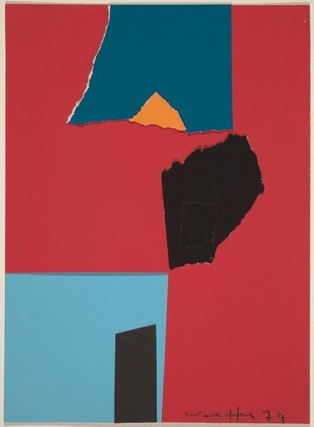 Curator: Clarence Holbrook Carter created this enigmatic print, "The Watcher," in 1977. It presents a striking combination of geometric shapes and surreal imagery. Editor: My first thought is how unsettling and yet peaceful it feels. The colors are calming, like a faded memory, but the single eye staring out throws everything off balance. Curator: That tension is precisely where the work finds its power. Carter, associated with modernism and pop art, was deeply engaged with exploring the subconscious and societal anxieties of the era. We might consider the rise of surveillance culture alongside philosophical ponderings related to the Self. Editor: The geometry almost feels like a stage set, or a minimalist building. Is that eye supposed to be watching the structure, or is the structure itself watching us? It's like the building is wearing the mask, which really flips things around in my mind. Curator: The ambiguity certainly lends itself to varied interpretations. Looking at the geometric forms, one can easily trace influences from minimalism; yet the single eye is suggestive of figurative traditions and alludes to an uncanny, even oppressive power dynamic. One could draw parallels to political discussions, where the watched are surveilled by unseen state powers, echoing the cultural climate during the cold war era and potential for personal intrusion. Editor: And yet, there's also something kind of playful about it, maybe because of the palette? Like a surreal children's book illustration that took a wrong turn. I mean the pop-art really shows. It doesn’t scream paranoia, just a sort of gentle unease that makes you question what's normal. I bet my kid would think this was super funny! Curator: It’s this combination of formalism, and representational fragment that challenges us, positioning 'The Watcher' in dialogue with modernist visual codes and surrealist symbolism. We must explore the anxieties prevalent during that time and situate this unique piece in relation to broader trends within conceptual practices that grapple with the nature of being watched. Editor: "The Watcher"... after this chat, I will definitely give Clarence Holbrook Carter more thought. Curator: Indeed, reflecting on Clarence Holbrook Carter's "The Watcher," we gain further appreciation for the complex ways in which personal expression can weave narratives within broader cultural and political landscapes.