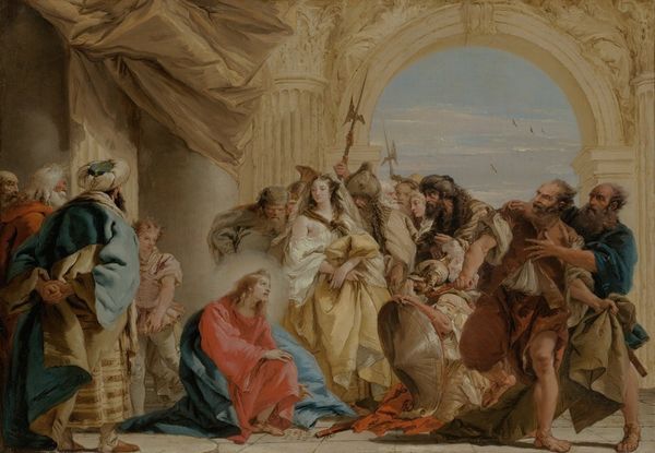 Nicolas Poussin’s ‘Adoration of the Shepherds’ presents a dynamic scene of devotion, painted with oil on canvas. Poussin constructs a theatrical space with a ruined classical architecture framing the holy scene. This juxtaposition sets up a semiotic dialogue between classical antiquity and Christian narrative. The arrangement of figures, bathed in a soft light, invites the viewer's eye to move across the canvas, engaging with each character's emotional response to the divine birth. The use of color, particularly the blues and earth tones, creates a harmonious balance. This reflects Poussin’s classical approach to art, where order and reason prevail. The geometric structure of the painting directs our gaze to the infant Christ. The broken pediment above, is held together by putti, symbolizing the Christian story as a renewal of classical ideals. Consider how Poussin uses formal elements not just for aesthetic pleasure but to explore philosophical and religious ideas. In doing so, Poussin prompts us to interpret the complex interplay between form and meaning.