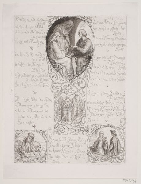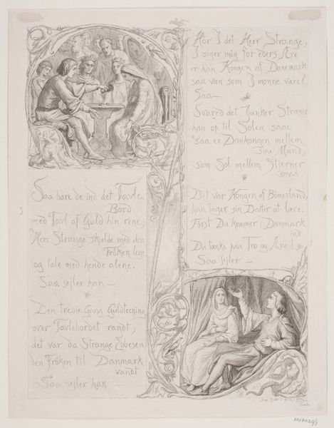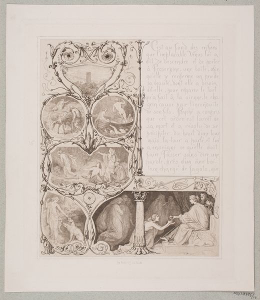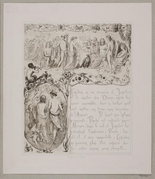 Editor: This is Lorenz Frølich's "Illustration nr. 3 til 'L'Amour et Psyché'," from 1862. It appears to be an engraving. What immediately strikes me is how it resembles a page from a medieval manuscript, or even a comic strip. There are these separate panels with very fine details, and then script between them. How do you interpret this work, considering its context? Curator: It's crucial to understand the context of illustrated books and their public role in the 19th century. Frølich wasn't just creating art; he was contributing to the wider dissemination of classical stories to a broader audience. The integration of image and text – as you pointed out, resembling a comic strip – makes this artwork so interesting, don’t you think? Editor: Yes, definitely! The combination of image and text suggests accessibility and, potentially, a desire to popularize classical mythology for a growing readership. Do you see that as a commentary on high versus low culture? Curator: It could be interpreted as such. During that period, there was tension between preserving 'high' art and making culture more accessible. Publishers often sought ways to render classic literature more marketable, as you mention, but this meant making sure that images such as these didn’t undermine elite authority by being perceived as unsophisticated. What do you think are the key visual motifs here? Editor: I see sphinxes, classical figures, winged creatures. All of it contributes to an atmosphere steeped in classical antiquity, like the imagery aimed for scholarly and upper-class readership. Curator: Precisely. And Frølich, by visually connecting it with newer media formats, subtly renegotiates the role of these visual symbols in a modern context. Considering that context, it makes this simple illustration more culturally relevant than initially apparent, doesn't it? Editor: Absolutely. It shifts my understanding of the work from simply an illustration to a piece of cultural commentary. Thank you.