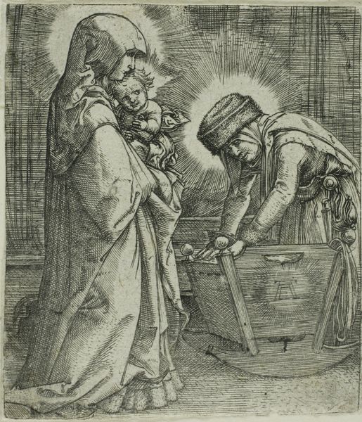 Editor: Here we have Albrecht Altdorfer's "The Virgin and Child with Saint Anne at the Cradle," a small print. It's quite intimate, but the figure on the right seems so out of place. How do you interpret this work? Curator: Well, consider the socio-political context. Altdorfer was working during the Reformation. The inclusion of a figure who seems almost like a contemporary burgher suggests an attempt to ground religious figures in the everyday lives of the viewers. Editor: So, it's not just a holy scene, but a reflection of its time? Curator: Exactly. It’s about making these figures relatable, aligning religious narrative with the viewer's social reality. It’s a very deliberate choice about the public role of art. Editor: I never considered it that way. Thanks for illuminating the connection between art and society! Curator: My pleasure. It is vital to consider the impact the socio-political scene had on art and its narrative.