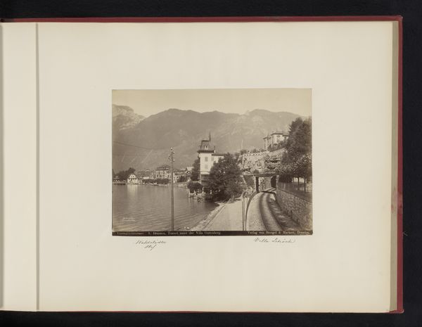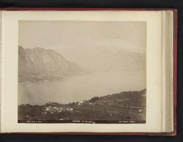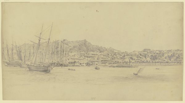 Curator: This is "Visser uitkijken op San Remo" or "Fisherman Looking Out on San Remo", a photograph dating from approximately 1872 to 1874 by Eugène Degand. It's rendered in watercolor and pencil on toned paper. Editor: My first impression is one of immense calm. The muted palette creates a tranquil atmosphere; the composition is neatly split by a serene expanse of water reflecting a mountainous skyline, offering a view of San Remo. It has a beautifully balanced but almost sepulchral stillness. Curator: It’s fascinating how Degand balances documentary and artistry here. The tonal variations achieved through the pencil and watercolor work really highlight the interplay of light and shadow, particularly across the built environment and the mountains beyond. Editor: Precisely. One can discern the subject is arranged very deliberately; on closer examination, the fisherman, the primary subject in terms of his material relation to the bay, sits quite deliberately amongst baskets, which indicate his labour and trade; this brings the scene, ostensibly one of ‘looking’ or reflection, back down to earth; back into the tangible materiality of daily labour. Curator: Do you see, also, how the geometry inherent in the buildings—the blocks and right angles—is softened and naturalized by the way the pencil renders them? This imbues the structural forms of the cityscape with an atmospheric quality. Editor: That reminds us to attend to the context in which the image has been crafted; to consider the social function of the work as perhaps contributing to, and cementing, certain picturesque ideals of what the bay *means*, its function more aligned with facilitating and consolidating tourist impressions. The method and arrangement would therefore necessarily need to present San Remo and its bay in a sympathetic, tranquil light, devoid of the messier aspects of everyday life and hard labour. Curator: Indeed, and to focus on how the formal qualities—the balance of horizontal and vertical, the subtle gradations of tone—work to elevate a simple scene into an emblem of peace and order. Editor: Well said. Ultimately, considering the perspective, both literally and figuratively, reveals complex dynamics at play; it serves as both a moment of reflective pause for the fisherman *and* a curated viewpoint for a broader, probably leisured audience. Curator: Thank you, it is rewarding to notice how this particular balance lends the piece a subtle, compelling charge. Editor: Agreed; to contemplate labor and artistry side by side provides a nuanced lens on that specific historical moment.