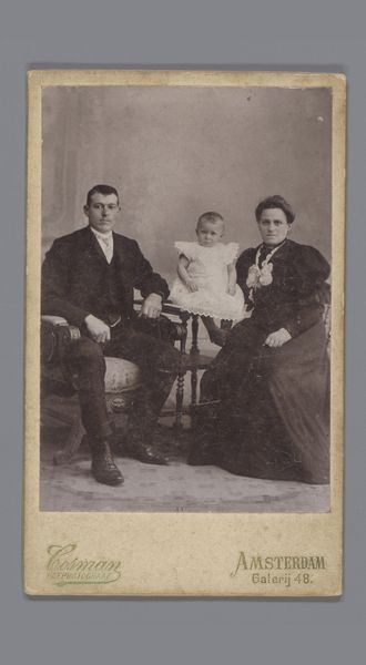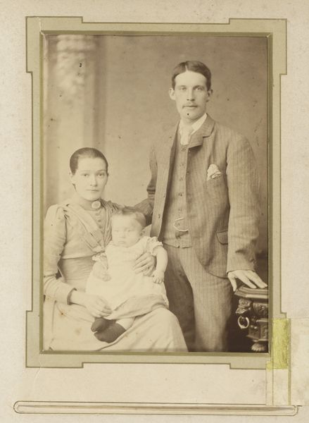 This is a photograph of a man and woman with a baby made by G. Lekegian & Co. The sepia tones lend an antique feel, like a memory fading at the edges. What I find fascinating is how the family is arranged, almost like a still life, with the baby perched precariously on a small table. The texture of the print is smooth, but you can almost feel the stiff fabric of their clothes. Look at the way the light catches the mother's dress, creating subtle patterns of shadow and shine. It’s as if the photographer is trying to capture not just their image, but also their essence. There's something about the formality of the pose that reminds me of early portrait photography, like the work of Nadar. Art is an ongoing conversation across time. There’s no right or wrong way to see it. It’s all about embracing ambiguity and letting your imagination wander.