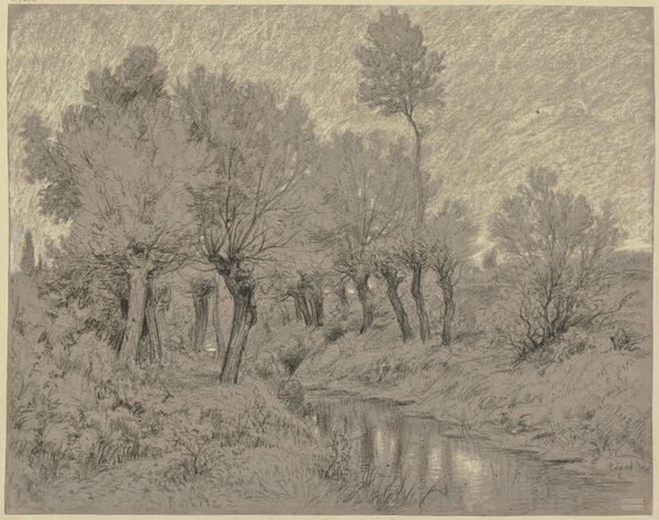Egbert Rubertus Derk Schaap made this charcoal drawing, titled 'Bosgezicht', on paper. The visible strokes reveal the artist’s engagement with the material. Charcoal, in its raw form, is simply burnt wood, a humble material transformed through the process of charring. Schaap coaxes depth and texture from the charcoal, with smudges and varied line weights suggesting the density and volume of the forest. You can almost feel the roughness of bark and the softness of foliage. Think about the labor involved, the repetitive strokes needed to build up such a complex image. The very act of drawing, with its direct, physical connection between the artist and the material, becomes a meditation on the natural world. By focusing on the simplicity and immediacy of charcoal, Schaap invites us to consider the relationship between the built environment and the natural one, emphasizing the importance of materiality, making, and context to fully appreciate the artwork.