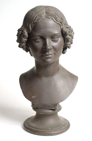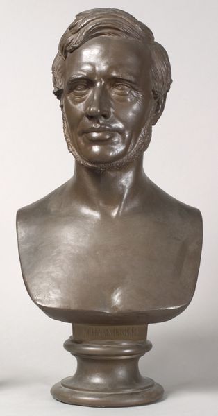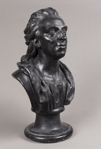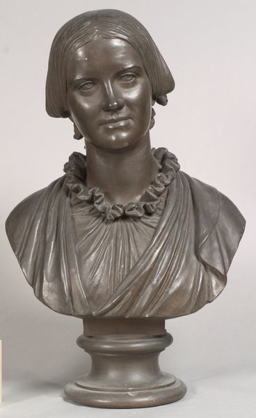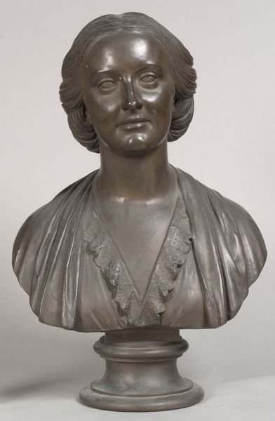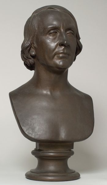 Editor: This is a bronze bust of Baronesse Sophie Hedevig Zeuthen, created in 1853 by H.W. Bissen. The smooth surface of the bronze gives it a sense of timelessness, but the features are so realistically rendered. How do you interpret the formal elements of this sculpture? Curator: Considering the formal aspects, the sculpture is quite restrained. Observe the subtle modulation of light across the face, achieved through meticulous modelling of the bronze. The hair, framing the face in simple waves, is a study in understated elegance. It invites us to consider not just the subject’s likeness but also the artist’s formal control over the medium. How does this restraint strike you? Editor: I see what you mean. It’s very different from more baroque styles, for example. The lack of ornamentation focuses your attention on the subject's face, which is quite powerful. It's realism, but an idealized form, maybe? Curator: Precisely. Consider the neoclassical influence here: a desire for order and clarity, evident in the simplified forms and balanced composition. There's a conscious effort to evoke a sense of enduring beauty, moving beyond mere imitation. Editor: So, the formal qualities aren't just about replicating reality, but about constructing a certain ideal through artistic choices? Curator: Indeed. Bissen's careful attention to line, volume, and surface texture work together to convey an impression of dignified refinement. The material itself, bronze, lends a sense of permanence and weight, further reinforcing this impression. Editor: I never thought about how the choice of material contributed to the overall message, but it makes perfect sense. I now see the "Baronesse" in an entirely new and complex manner. Curator: Understanding art through its formal properties allows us to engage with the artwork on a profound intellectual level. It underscores that the arrangement of an artwork's elements impacts our interpretation and appreciation of the piece.