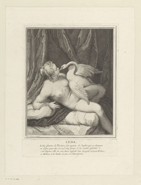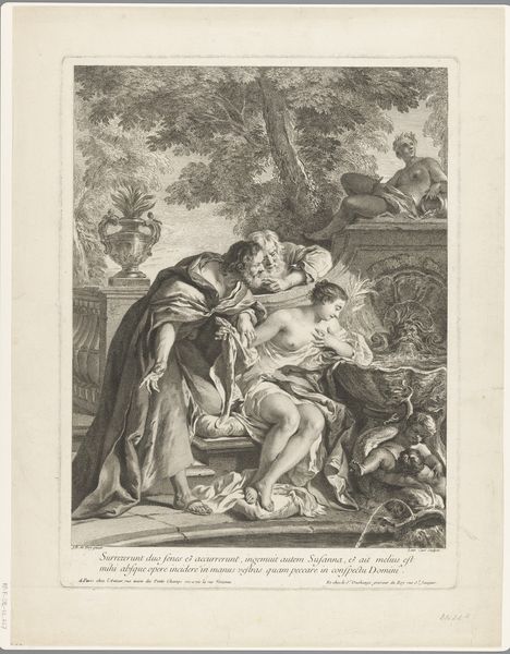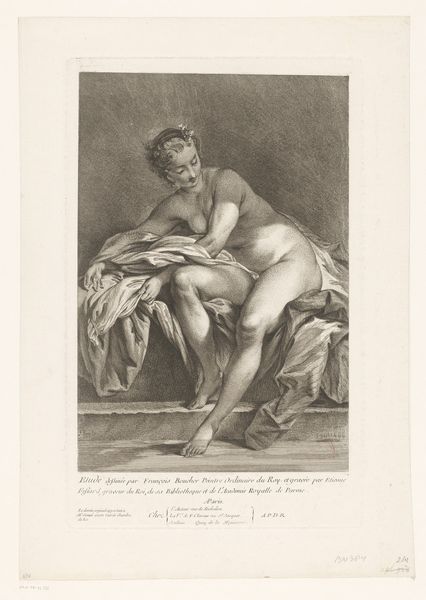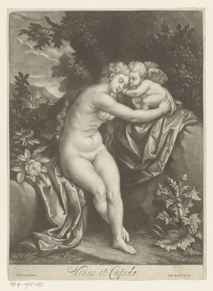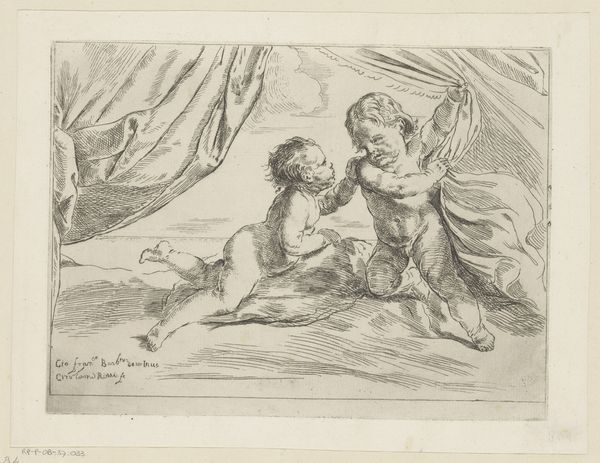 Curator: This engraving at the Rijksmuseum is entitled "Two Playing Children: Spring and Autumn" by Hendrik Bary, likely completed between 1659 and 1677. The detail achieved within this medium is quite remarkable, isn’t it? Editor: It is, though initially, the plump figures set against that dark background give it a somewhat unsettling feel. It almost veers into caricature, doesn’t it? Yet, the tonal range in the drapery is striking. Curator: Yes, I see your point regarding the initial impression, but I am intrigued by the Baroque embrace of symbolism here. The child adorned with a floral crown clearly represents spring, while the other holds ears of wheat. Consider how Bary has used line and form to delineate not just the physical characteristics but also abstract concepts of time and seasons. Editor: And notice how Bary links these seasons. It's a very idealized, almost utopian vision of childhood linked directly to the fertility and abundance of the land. What sort of context could have spurred such a benevolent image? The engraving’s inherent multiplicity—its purpose for wider circulation—signals this ideal wasn’t niche. Curator: The figures exhibit a dynamic contrast in texture – the smooth, almost porcelain skin of the children against the detailed folds and fabric of their covering. The texture created in this medium allows the viewer to feel they can almost grasp what is occurring in this piece. Also, Bary expertly models their forms using subtle gradations of light and shadow, adhering to the chiaroscuro aesthetic. Editor: From a purely historical perspective, pieces such as these became tools of social communication, solidifying seasonal traditions through accessible imagery. Their idealized portrayal offered a comforting view amid socio-economic conditions often defined by agricultural dependence and seasonal uncertainty. This is much more than artistic exercise; this piece demonstrates a desire for harmony and balance in life. Curator: An interesting interpretation! The contrasting of smooth and rough texture alongside dramatic contrast in shading definitely allows this message to be perceived. I will certainly reconsider my view of this artwork after hearing your remarks. Editor: And I am certainly impressed with how Bary can imbue even an engraving with a dynamism. It brings an otherwise static medium to life with playful thematic engagement.