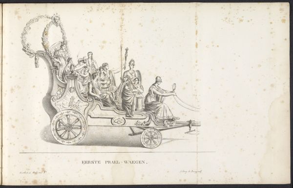 Curator: This pen and etching, dating from 1865, is titled "Spotprent op de Nederlandsche Maatschappij tot Bescherming der Dieren," or "Caricature of the Dutch Society for the Protection of Animals." It's by Johan Michaël Schmidt Crans. Editor: My first impression? Satirical and scathing! There’s a stark visual contrast between those pulling the carriage and its entitled passengers, and there's definitely an underlying message being conveyed through its caricature style. Curator: Indeed. The work reflects the societal tensions surrounding animal welfare at that time. The "Dutch Society for the Protection of Animals," established in 1864, sought to address cruelty in animal treatment and slaughter. This image specifically satirizes the gap between the Society’s supposed goals and its practical impact. Editor: Precisely. Look at the figures in the carriage—they appear to be wealthy men smoking cigars, while animals are stuffed haphazardly inside, also smoking. And then those workers at the front...It's an incredibly sharp critique of bourgeois society, with animal cruelty serving as a pointed metaphor for class inequality and power dynamics. The artist challenges the idea that animal welfare can be separated from broader societal injustice. Curator: Yes, the smoking adds a layer of commentary about excesses and indifference. The animals smoking alongside the men suggest a shared, yet forced, participation in harmful behaviours. It speaks volumes about how industries and societal structures normalize mistreatment across different species. Editor: And the carriage itself, pulled by labourers rather than horses, emphasizes the exploitation inherent within these systems. There’s a compelling analogy here—where those who are supposed to care are instead burdening others and participating in these destructive activities. It highlights complicity. Curator: Considering its social realist style and pointed political messaging, this piece is clearly aiming to incite reflection, perhaps even action. Crans effectively uses caricature to dismantle the public image of the society and expose the underlying hypocrisy of social structures. Editor: Absolutely. It certainly made me rethink the nuances of societal efforts towards welfare then, as it continues to prompt broader considerations of power structures in contemporary times. Curator: A powerful example of art's role in critiquing societal issues and instigating dialogue, then and now.