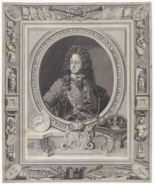 Curator: The artwork before us is a portrayal of Armand Gaston Maximilien de Rohan, rendered in 1732 by Laurent Cars. It’s an engraving, a delicate dance of line and tone. Editor: My first impression? Power, definitely. But also, a certain fragility. The subject seems both imposing and strangely vulnerable, trapped within this baroque framing device. Curator: Indeed. The portrait resonates with the complexities of the period, when church and state were inextricably linked. De Rohan, a Cardinal, wasn't merely a religious figure; he was a man deeply embedded in the political machinations of 18th-century France. The Rohan family held immense power and influence, and Armand Gaston was part of many scandals and controversies that had the aristocracy in an uproar. Editor: Look at how Cars uses line. The meticulous detail in the face and costume – every curl in the wig, every fold in the fabric meticulously rendered, then juxtaposed against a heraldic frame! It gives depth, literally and figuratively. The lines delineate both form and social stratification. Curator: Exactly. Engraving was a medium that could be reproduced, disseminating images and ideas. The purpose here was not just documentation, but also the manufacturing of authority. His regalia speaks to lineage and to divine privilege. Notice that it places him as central not only within the church but also in secular French governance. Editor: Yet, there's a somber quality about it, would you agree? Perhaps it’s the limited tonal range of the print or even how de Rohan himself has been posed, which evokes melancholy or introspection rather than grandiosity. Curator: It reflects his shifting allegiances, a life marked by personal gain and struggles with royal decree. This tension gives depth and nuance. His narrative extends far beyond the lines etched onto this plate; his engagement and conflicts continue even to the dawn of the revolution. Editor: A compelling visual paradox then – the controlled, refined lines of the engraving capturing the subtle chaos of a life lived within such monumental shifts in the culture. It captures something elemental regarding social unrest and how its implications and machinations often hide in plain sight. Curator: It serves as a valuable object lesson for our times as we try to disentangle identity from privilege and governance.
