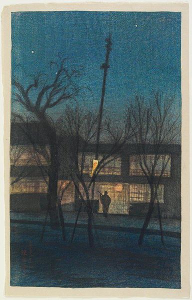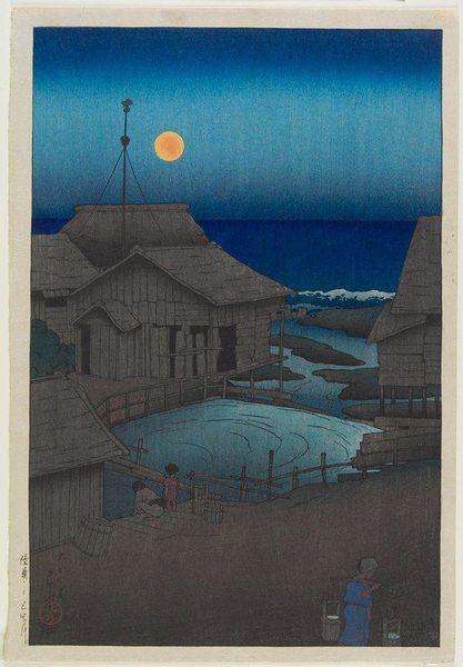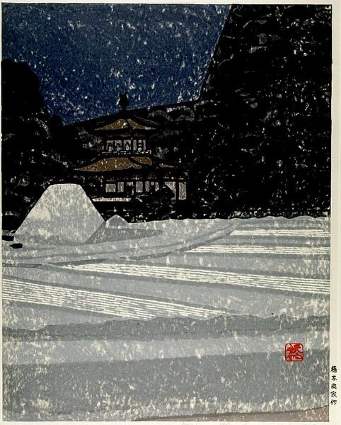 Hasui Kawase's woodblock print, "Self-Portrait at Kiyomizu Temple, Kyoto," invites us into a tranquil, moonlit world. The layering of blues, from the deep indigo sky to the subtly textured wooden planks, evokes a sense of calm and introspection, almost like a visual poem. I love how the artist captures the scene. You can feel the cool night air and the stillness of the temple grounds. The solitary figure, presumably Kawase himself, is rendered with soft outlines which blend into the background. Look closely at the shadows cast by the railing; they create a rhythmic pattern, mirroring the structure of the temple itself. It’s this kind of close attention to detail, alongside the masterful use of color, that sets this print apart. Kawase's contemporary was Hiroshi Yoshida who, like Kawase, was a leading figure in the Shin-Hanga movement. Both artists shared a commitment to depicting landscapes with a modern sensibility, yet their approaches differed. Where Yoshida often favored dramatic compositions and bold colors, Kawase's work is characterized by a quiet lyricism and subtle tonalities. Both artists embraced the beauty of imperfection and the ever-changing nature of the world around them.
