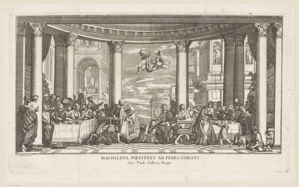 Nicolas Cochin etched this print, "Christ and the Pharisees in the Temple," capturing a pivotal biblical scene. The temple, with its classical columns and statues, is laden with symbolic weight. The classical architecture is not just a backdrop but a statement of power and tradition. Consider the gesture of Christ: calm yet resolute, a beacon of spiritual authority amidst the storm of dogmatic challenge. This contrapposto stance, echoing ancient sculptures, reappears through time, from depictions of emperors to Renaissance heroes, embodying moral strength. The Pharisees, with their theatrical gesticulations, betray unease. Their expressions, almost caricatures, suggest a deeper fear of the challenge to their authority. The visual tension speaks to a universal struggle: tradition versus change, the established order versus the revolutionary idea. These symbols have reappeared throughout time, in political posters and religious pamphlets. The image taps into our collective memory, engaging viewers on a subconscious level. This scene is not just a biblical event, but a timeless representation of human conflict and the cyclical nature of history.