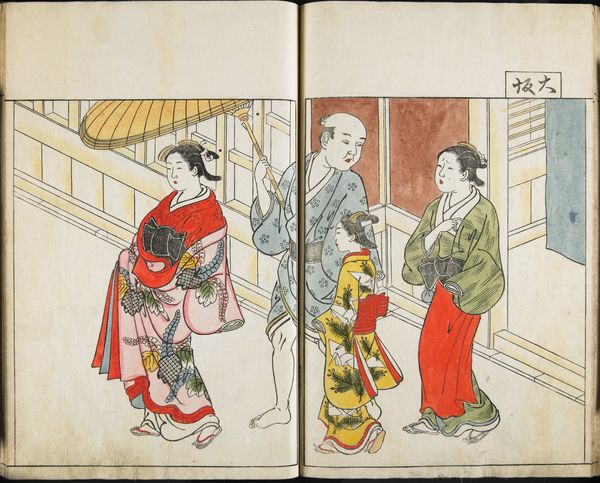 Curator: Here we see an opened book, revealing two pages of a color woodblock print titled "Illustrated Book on Annual Events in the Gay Quarters," created in the late Edo period. It’s attributed to Kitagawa Utamaro, with designs by Jippensha Ikku. Editor: The lanterns immediately strike me. Each one feels like a little world, hinting at hidden celebrations and intimate moments. Curator: These lanterns, symbols of festivals and gatherings, illuminate the pleasure quarters. They suggest a world of entertainment and artistry, but also of social hierarchy. Note how the central figure seems to orchestrate the event. Editor: Yes, and the repetition of faces, the way they’re framed by the lanterns, feels very deliberate. It evokes a sense of collective identity, but also a kind of anonymity within the bustling Yoshiwara district. Curator: Indeed, Utamaro's masterful use of line and color not only captures the fashion of the period, but also subtly reflects the complex social dynamics at play. Editor: It makes you wonder about the stories these women could tell, both joyful and perhaps tinged with melancholy.