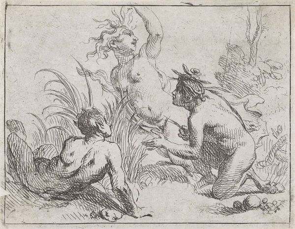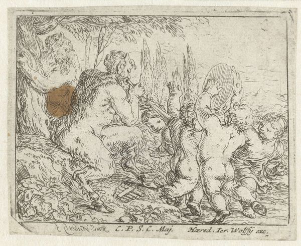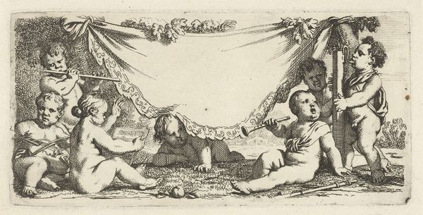 Cornelis Schut created this print, "Two Children with a Bunch of Grapes", sometime before his death in 1655, and the small scale draws us into its intimate world. The composition, balanced yet dynamic, features two cherubic figures amidst a lush landscape. Schut’s use of line is particularly striking. Notice how the delicate, closely-knit hatching defines the figures' plump forms and the textures of the foliage. This technique not only models the shapes but also creates a sense of depth and volume, especially in the rendering of the grapes and the children's skin. The landscape setting is more than a backdrop; it intertwines with the figures, suggesting a harmonious relationship between humanity and nature. The grapes, symbols of abundance and fertility, are centrally placed, drawing the viewer's eye and reinforcing the theme of natural bounty. Consider how Schut’s formal choices contribute to the artwork’s meaning. The intricate linework and balanced composition invite a deeper reading of the relationship between form and content, revealing layers of cultural and philosophical context embedded within this small, yet powerful, print.