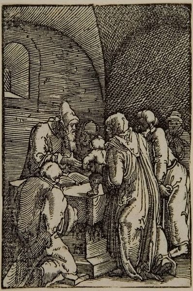 Albrecht Altdorfer created this woodcut, "The Presentation in the Temple, from The Fall and Redemption of Man," sometime in the early 16th century. Altdorfer was working during a tumultuous period marked by religious reformation and social upheaval. This print depicts a biblical scene through a lens deeply influenced by the cultural and religious transformations of the Renaissance. Altdorfer sets the Holy Family within the architecture of his contemporary world. The use of a woodcut allowed for wider distribution of such images, engaging a broader audience in religious narratives. Consider how the artist uses stark contrasts and detailed lines to evoke the solemnity of the event, emphasizing the emotional exchange between the figures. The small size of the print invites an intimate, personal engagement, reflecting the era’s shifting relationships between the individual and religious authority.