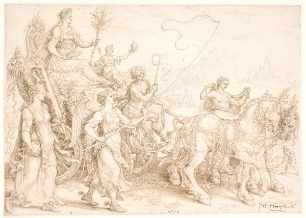 Curator: Looking at this drawing, I am struck by its dramatic, almost theatrical energy. Editor: Indeed! The level of detail, the sheer density of figures, all rendered in ink on paper. It’s overwhelming, yet compelling. What am I seeing here? Curator: This is "Aanklacht tegen de drie jongelingen Sadrach, Mesach en Abed-nego," or, "Accusation Against the Three Youths, Shadrach, Meshach, and Abednego," created in 1564 by Maarten van Heemskerck. Editor: Right away, I recognize this is from the Book of Daniel. Three Jewish men refuse to bow to a statue erected by King Nebuchadnezzar, here seen on horseback, canopied and elevated—symbols of patriarchal authority and imperial power. Their crime is resistance. Curator: Notice how Heemskerck emphasizes the splendor of the king juxtaposed with the stoicism of the accused. The statue in the background… what cultural values was the artist emphasizing by using an overtly classical form? Editor: He’s visually linking Nebuchadnezzar to Roman emperors, equating that ancient authority with the power structures of 16th century Europe. The youth’s refusal is, by extension, resistance against any earthly tyranny that demands obedience over spiritual convictions. Curator: Note the rigid poses of the guards, echoing the lines of their spears. In contrast, the three youths appear almost… vulnerable. Editor: Vulnerable, yet resolute. Consider what this meant in the context of the Reformation, during which people faced persecution for their faith. The drawing becomes a symbol of religious defiance against oppressive rulers. A powerful statement of human agency against systemic injustice. Curator: I agree, the timelessness of this narrative provides an echo through the ages of human striving for spiritual autonomy. What really endures with this piece, I think, is how expertly Heemskerck portrays an iconic, universal struggle, reduced to individual moral conviction. Editor: For me, it lies in understanding how artists use historical narratives to comment on their own times. "Aanklacht tegen de drie jongelingen Sadrach, Mesach en Abed-nego" is not simply an illustration; it's a timeless cry for justice and a beacon for anyone standing up to power.