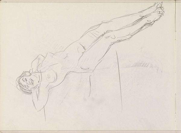 Editor: This drawing, "Standing Female Nude, Leaning" by Isaac Israels, probably created between 1875 and 1934, is really captivating in its simplicity. I’m struck by the vulnerable pose of the figure. What visual cues or symbols are speaking to you in this work? Curator: This sketch evokes a specific cultural memory, doesn’t it? Consider the pose itself – the slightly arched back, the extended arms. It recalls classical depictions of Venus, but stripped bare, almost raw. What emotional effect does this have on you? Editor: I see what you mean. There's this classic beauty, but made… modern, maybe even a bit uncomfortable? Curator: Precisely. Israels seems to be engaging with, and almost dismantling, traditional ideals of feminine beauty. The quick, loose lines of the pencil suggest immediacy and a break from the highly polished academic style of earlier nudes. Is the arm covering the face symbolic in any way, how might that affect a contemporary audience's reading? Editor: It feels almost defensive, but maybe also a bit like a surrender? Like the figure is both protecting herself, and also exposed in her vulnerability? Curator: That's a key point. How much of what you see is from contemporary influence or do you imagine audiences of that era also understood the body with their own inherited visual symbols? These visual signs speak volumes. It invites contemplation on changing cultural perceptions of the body, its representation, and the evolving role of women in society. What new ideas does this give you regarding his intentions? Editor: It’s making me think about the male gaze, and how that's changed over time. I hadn't considered the audience perspective in that way before. Thanks! Curator: Indeed. A pencil sketch from between 1875-1934 continues to inform us about where we are today.