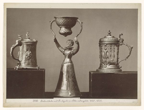 Curator: Here we have a striking still-life photograph by Charles Clifford, likely taken between 1850 and 1863. It depicts an ornate goblet, a “Beker met gevleugelde draak en roofvogel,” crafted from silver and other metals. Editor: My first thought is the dramatic contrast! The goblet seems to float against the dark background, all sharp angles and meticulous detailing, emphasizing the play of light on the metallic surface. Curator: Indeed. Note how Clifford masterfully uses light and shadow to articulate the goblet’s complex form. The interplay between the smooth, reflective surfaces and the intricate sculptural details, like the dragon and raptor motifs, creates a fascinating visual texture. It invites the eye to dance across its surface. Editor: Speaking of which, that peculiar dragon handle looks like something from a Renaissance prince’s cabinet of curiosities. I'm interested in the statement such objects made when depicted in early photographs. Was it simply documenting craftsmanship, or subtly aligning the owner, or commissioner of the work with grand historical narratives? Curator: It is impossible to be sure, of course, but the photograph speaks, undoubtedly, to the rising prominence of photography within the applied arts and how still life was deployed to assert the value of everyday items. The piece balances a celebration of opulent objects with the rise of a bourgeoise culture in love with possessions. Editor: Do you think that duality can explain why these luxury objects were favored subjects for early photography? Because it seems that many photographs celebrated the same symbols of wealth and taste while ostensibly democratizing art appreciation. Curator: I believe that is likely correct. By immortalizing such luxurious items in a new medium, they acquired another kind of social relevance that went beyond mere functionality and aesthetic pleasure, though not against it. What else strikes you? Editor: The choice to present it as a photograph emphasizes realism but then stylizes it using this almost theatrical spotlight. It creates a tangible object that borders fantasy and underscores its worth as an emblem of the owner’s, and perhaps society's, imagination. Curator: Precisely. Clifford’s photograph operates as both record and symbolic performance. I’ve found this piece particularly instructive for considering photography’s complex role within society, and its influence on art historical practice, during this period. Editor: Yes, a study in contrasts, offering a surprisingly nuanced glimpse into how early photography navigated the world of art and commerce.
